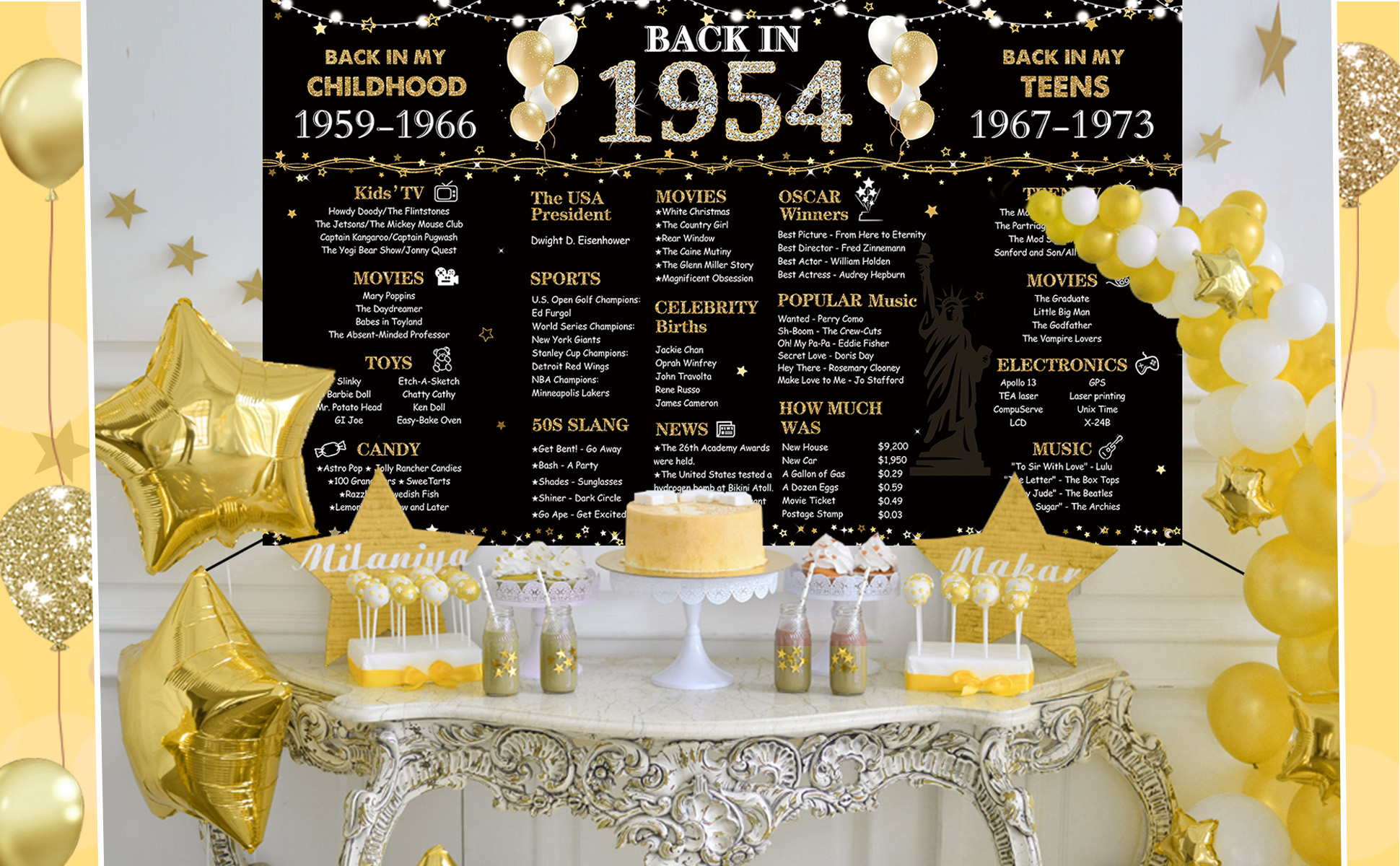 [Back in 1954 Theme] - Back in 1954, the banner design was exquisite, as a whole, under the background of bright black and gold, interspersed with interesting birthday theme elements, the history of the text, beautiful design, classic of the statue of liberty, many popular elements, bold font, give you a fantastic visual enjoyment, and what happened in 1954 facts, attract more families or guests to join you, have a happy and meaningful 70th birthday/anniversary party!