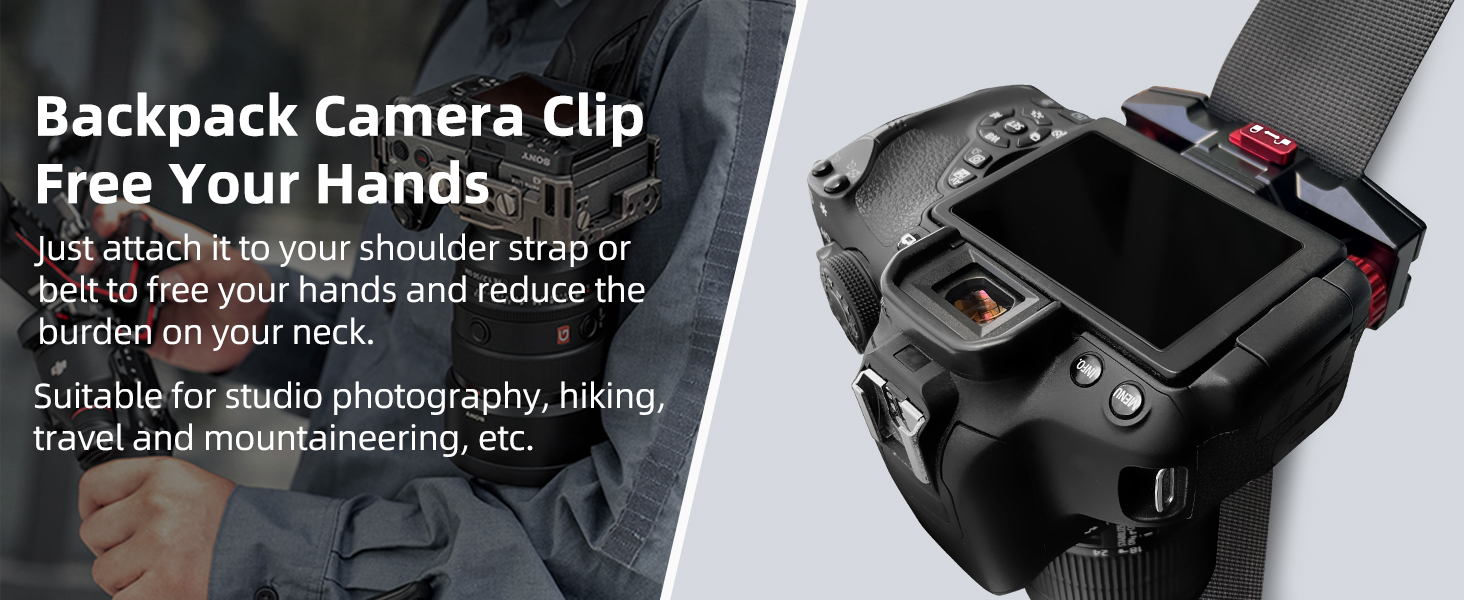 🎁 Backpack Camera Clip &Free Your Hands 🎁 Install DSLR camera to the backpack straps or belt with camera clip to free your hands and reduce the burden on your neck. The Camera Clip for backpack enables you to quickly mount and lock your camera, suitable for studio photography, hiking, travel and mountaineering, etc. 🥃🥃NOTE: Camera Backpack Clip attaches to any strap/belt up to 2.87in/73mm wide and 0.39in/9mm thick.
