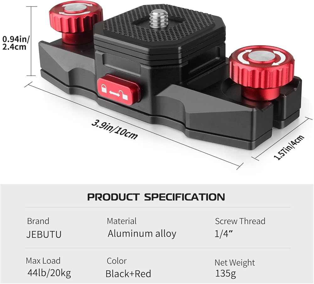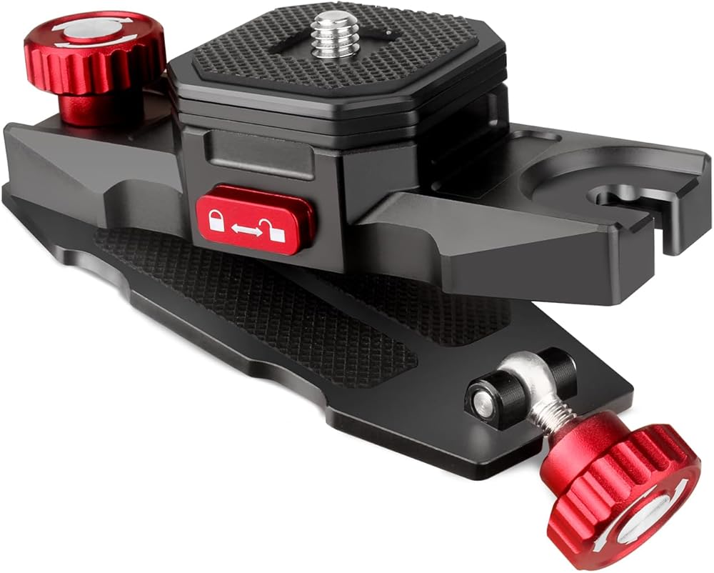 ⛄ Double Security Safety Lock ⛄ ❶ camera belt clip designed with one more secure safety lock to to avoid accidental release.❷ Note: 🌞When using the safety lock, you need to press the QR plate and then hear a clicking sound (there is no gap between the plate and the bottom), at this time push the red knob directly to the lock mark! 🌞If you want to release the plate, please turn the red locking knob in the direction of the unlock mark and press the red button on both sides of camera clip