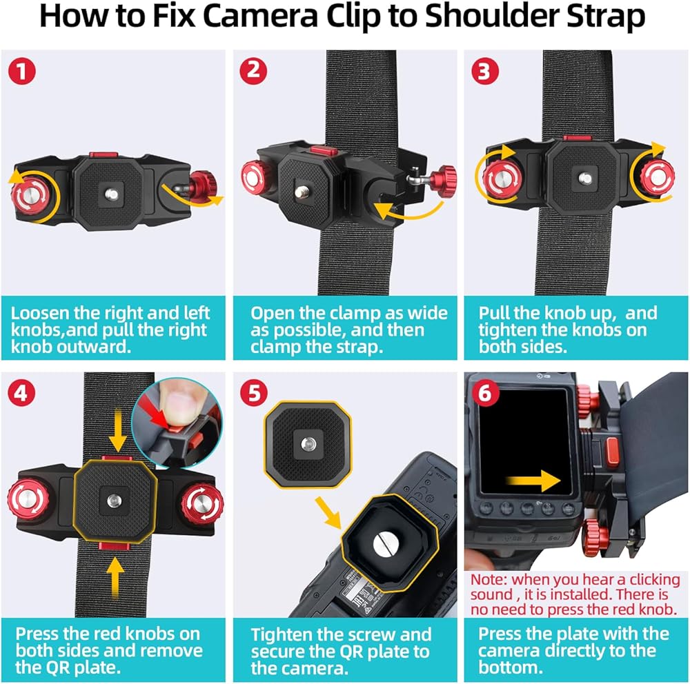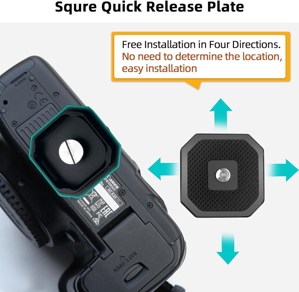 🍩 Easy to Install & Release 🍩 ❶ Press the red button on both sides of camera clip, camera quick release plate will be removed instantly. ❷ Standard square quick release plate can be installed in all four directions at will. There is no need to determine the location. ❸ Press quick release plate with the camera directly to the bottom. Note: when you hear a clicking sound , it is installed. There is no need to press the red knob.