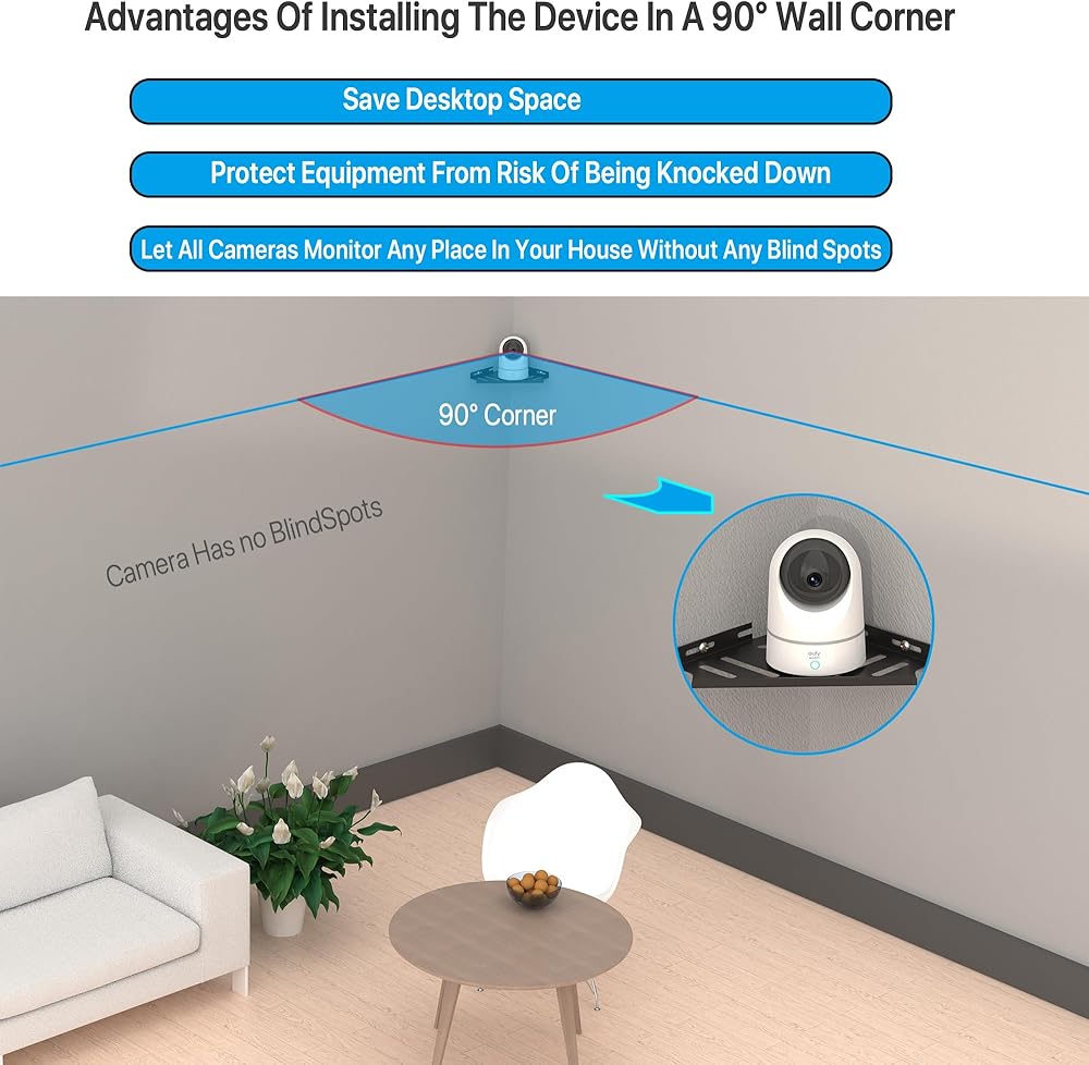 Space-Saving Solution: Mounting your surveillance device in the corner frees up valuable table or counter space, keeping your room tidy and clutter-free.