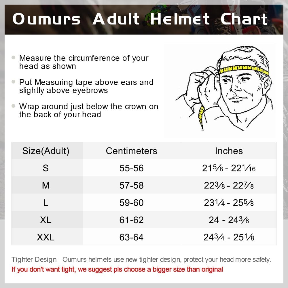 Size - OUMURS Dirt Bike Helmet include Adult-M (570 - 580 mm / 22-3/8" - 22-7/8" );Adult-L (590 - 600 mm / 23-1/4" - 23-5/8");Adult-XL (610 - 620 mm / 24" - 24-3/8" );Adult-XXL (630 - 640 mm / 24-4/5" - 25-1/5" )