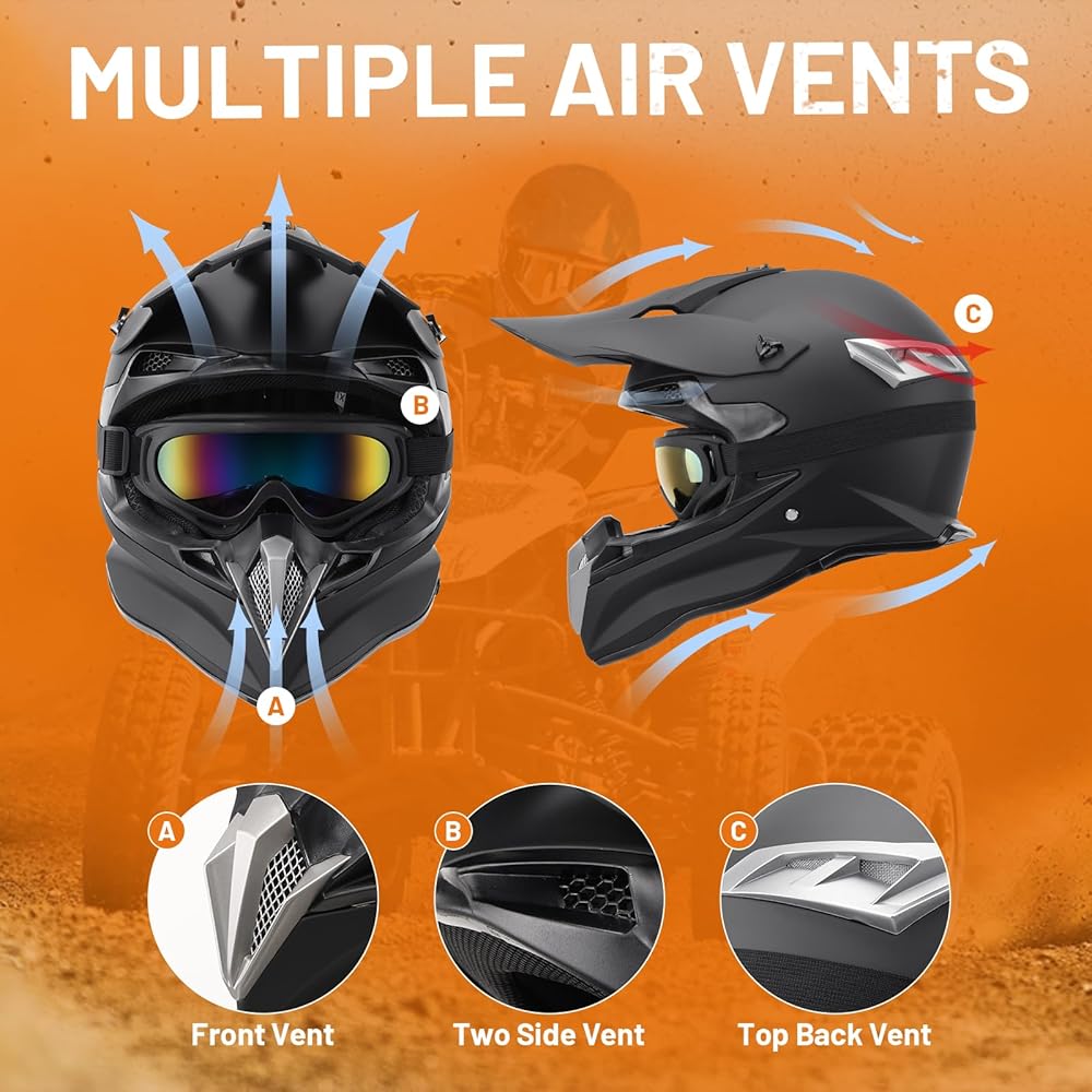 Multiple Air Vents Design - The adult ATV helmet have multiple air vents, make fresh air keep entering the helmet, You can have a good riding experience even in hot summer. The optimized vent reduces the wind noise and can ride more quietly with this adult ATV helmet