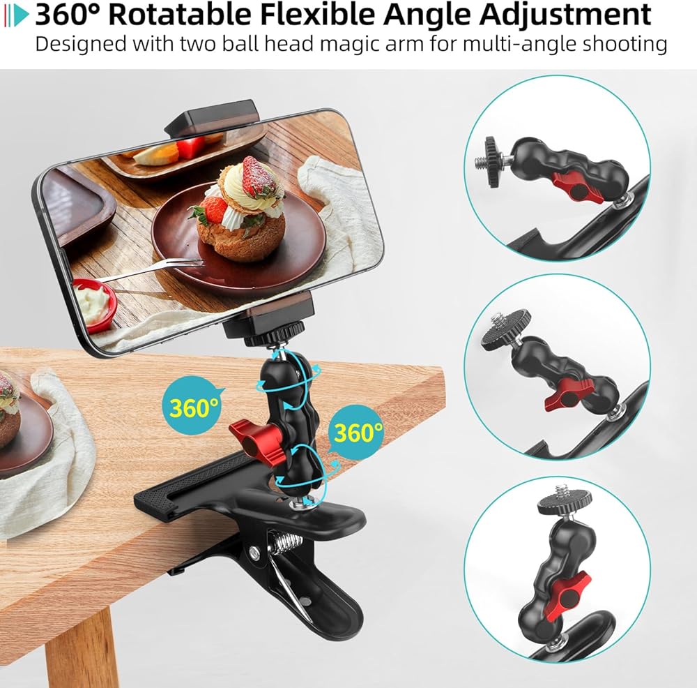 🍧 More Durable & More Stable🍧 ❶JEBUTU tripod camera clip clamp with 3.1" Dual Ballhead Magic Arm is made of high quality stainless steel & iron & rubber, which is very well-made and durable. ➋ JEBUTU Super Clamp Ball Head Mount is designed with protective dense non-slip rubber pads in the clamp to reduce scratches and improve the overall stability.