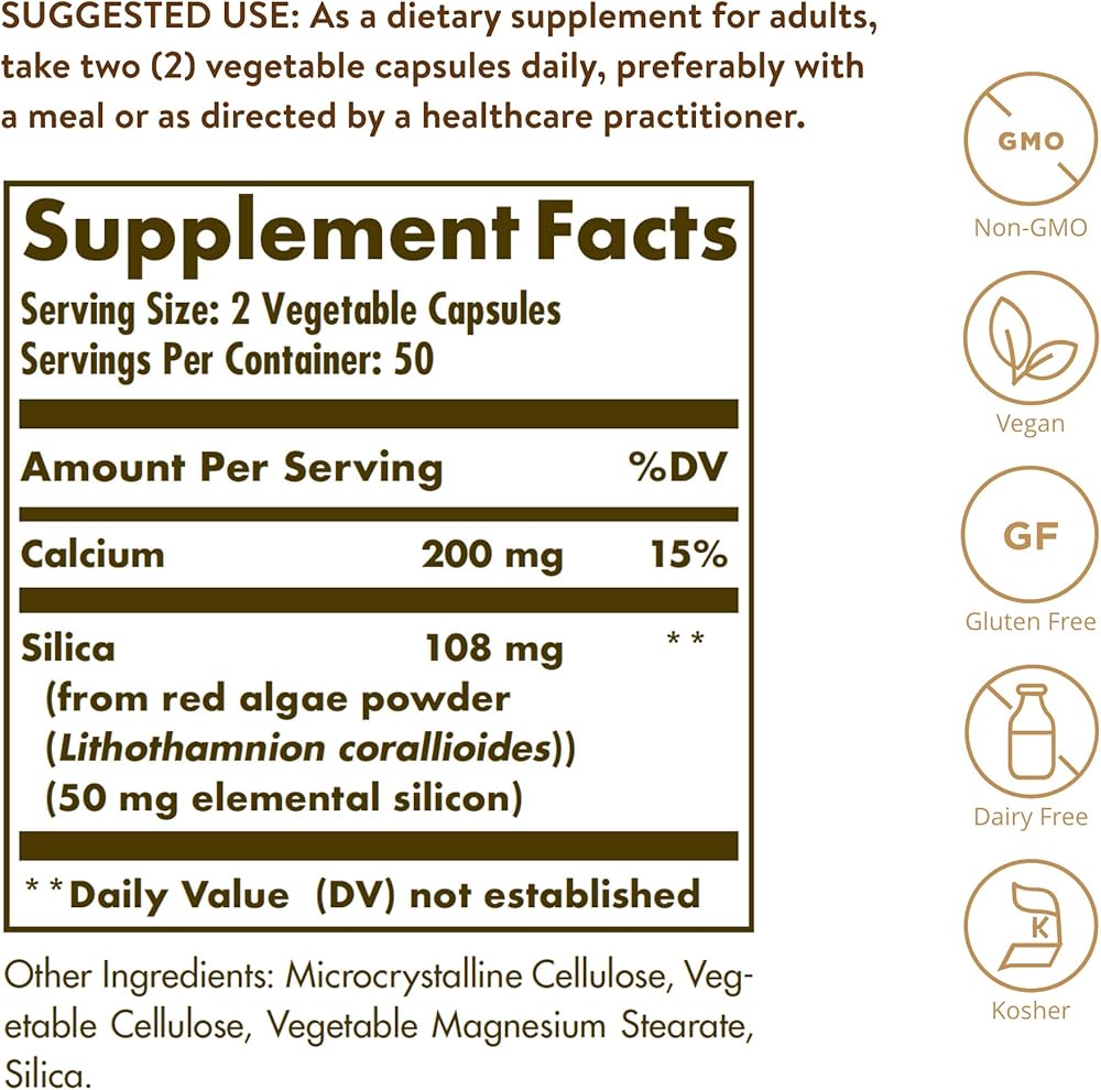 Bone Health; Silicon intake has been positively associated with bone health; Solgar Oceanic Silica from Red Algae is an excellent source of calcium