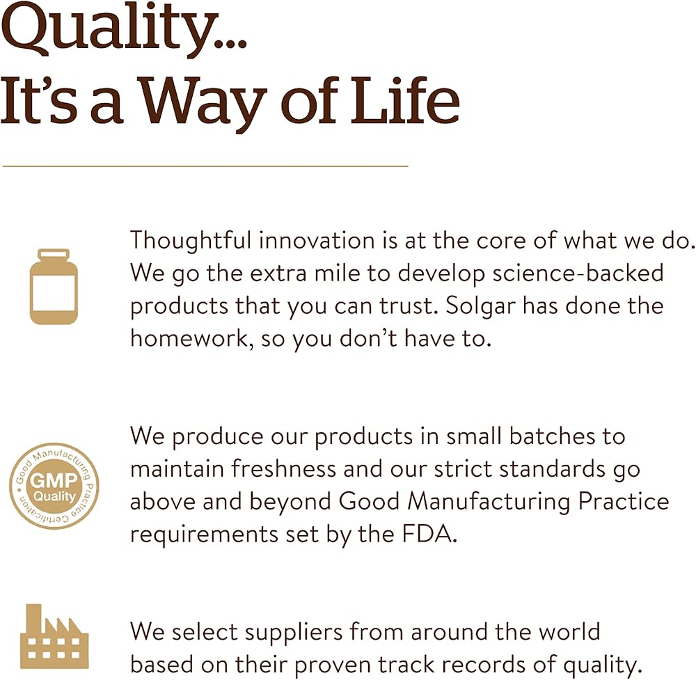 The Gold Standard: For over 70 years, Solgar has been committed to quality, health, and well-being. Our mission is to create the finest nutritional supplements in small batches, through tireless research, using only the finest raw materials