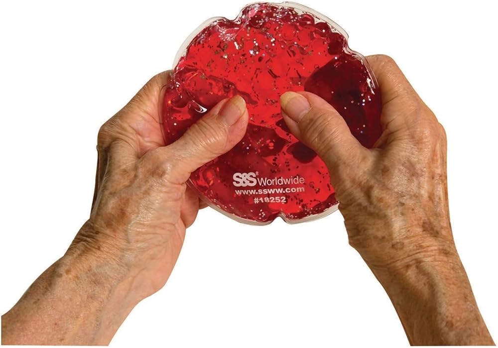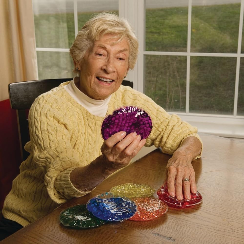 A tactile experience like no other! The sensory qualities of these discs provide tactile and visual stimulation sure to calm and soothe ... they're pretty darn difficult to put down! The translucent "beads," glitter and colored gel inside make each disc incredibly squishable and cool to the touch. Perfect for sore or arthritic hands! Set of 6 discs in six colors. 5" diameter. Do not freeze. The filling for our squishy disc is made from Distilled Water, Food Grade Dye, Polyacrylamide Beads, and Glitter and is non-toxic.