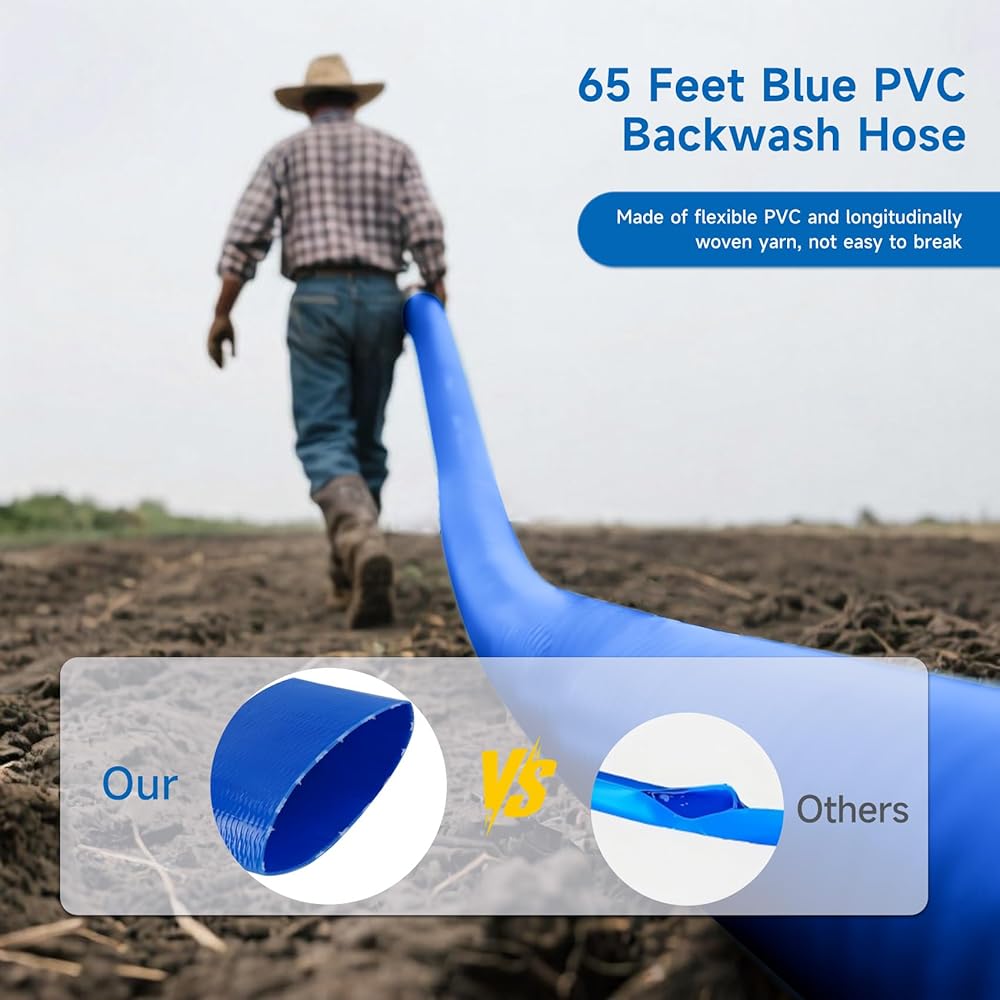 【Suction Hose Kit]】 Contains 2”×20ft Blue PVC suction hose, 2-inch x 65-ft blue PVC backwash hose, filter*1, cam and groove adapters*2, suitable for various types of pipes.