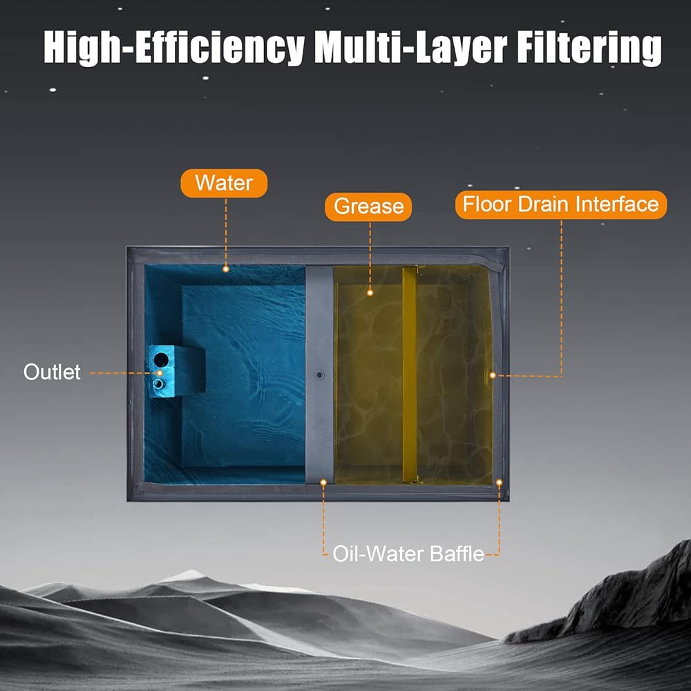 [3 STEPS FRACTIONAL FILTRATION]: Fractional filtration is adopted on our 30 LBS commercial grease interceptor to achieve a better oil-water separation effect, whose flow rate is about 15 GPM. The solid waste and grease will be collected by the mesh basket & filter baffle firstly, and then the oil and filtered water will be discharged from the outlet valve and drainage outlet successively.