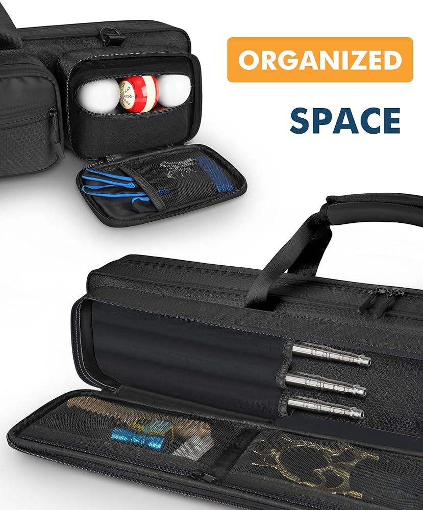 ROOMY SPACE: The pool cue case measures 32.5"L x 6" W x 6.5"H. The main compartment can hold 4 butts and 5 shafts, which adapt to various pool cue quantity requirements, such as 3×5, 4×4, 3×3, 2×2, etc. This pool stick case also has 2 external pockets, providing roomy space for the things you need. Among them, the big pocket can store 3 retractable bridges and other accessories, and the other pocket can hold 3 cue balls and a pair of gloves.