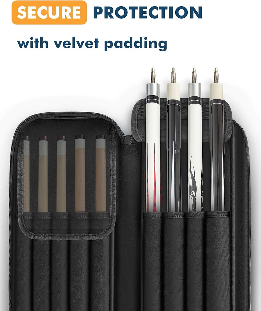 SECURE PROTECTION: The cue stick case provides ample protection. This billiard cue case is made of waterproof ingredients as a whole, so it is not afraid of rain. The interior space is fully padded with velvet, which can protect your billiard cues from bumps and scratches. Plus, there are 2 padded elastic covers, which can also protect the cue tips.