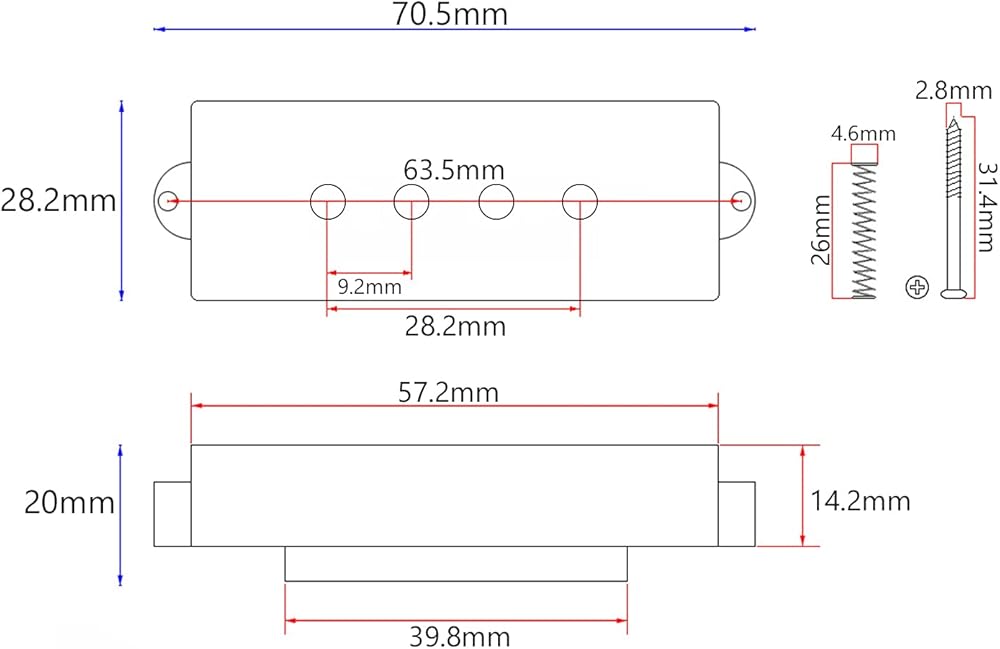 • Each Double Coil Pickups Size: 70*27*14mm/2.76*1.06*0.55in, total weight: 130g/4.59ounces, Color: black, Pole pieces: 4 flat pole piece. Pole spacing: 28.5mm/1.12in