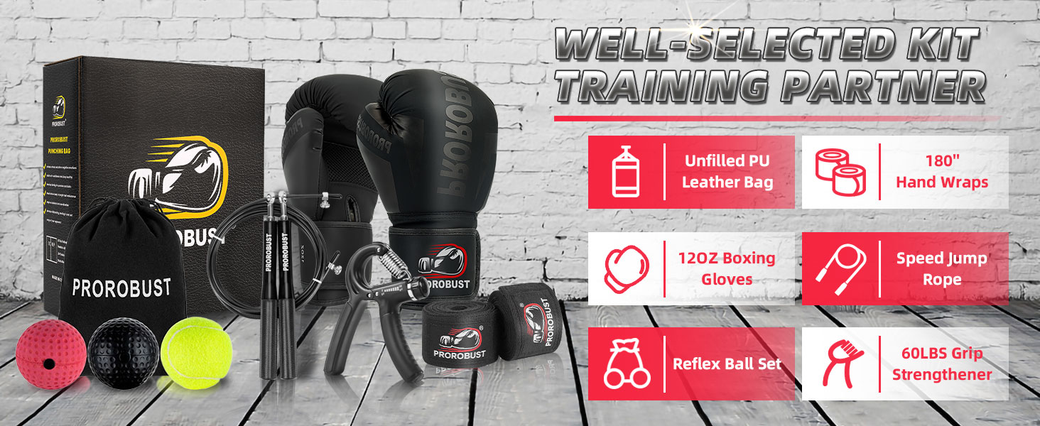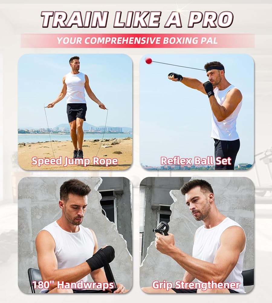 【Well-Chosen Boxing Set】Aiming to provide a professional and effective training regime, the high-quality selection of boxing equipment consists of 4ft punching bag, 12 oz boxing gloves, 180-inch hand wraps, speed jump rope, reflex ball sets, and grip strength trainer. Train like a boxing champion and get the results.