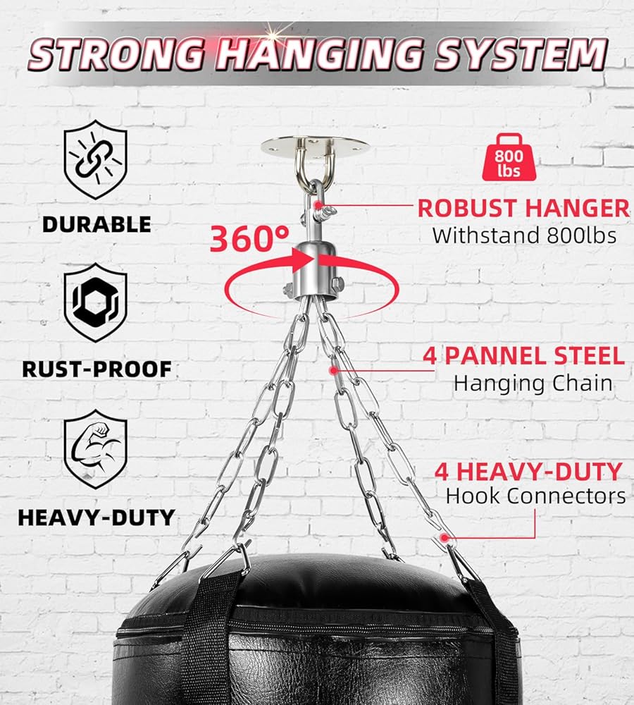 【Power In Every Punch】The 360-degree swivel chain rotates freely in accordance with your punches, allowing boxing bag return to its steady position and ready for the next seamless strike. The 800lbs loading capacity of the mounting parts guarantees safety during an intense session. Set it up, land blows and push your limits.