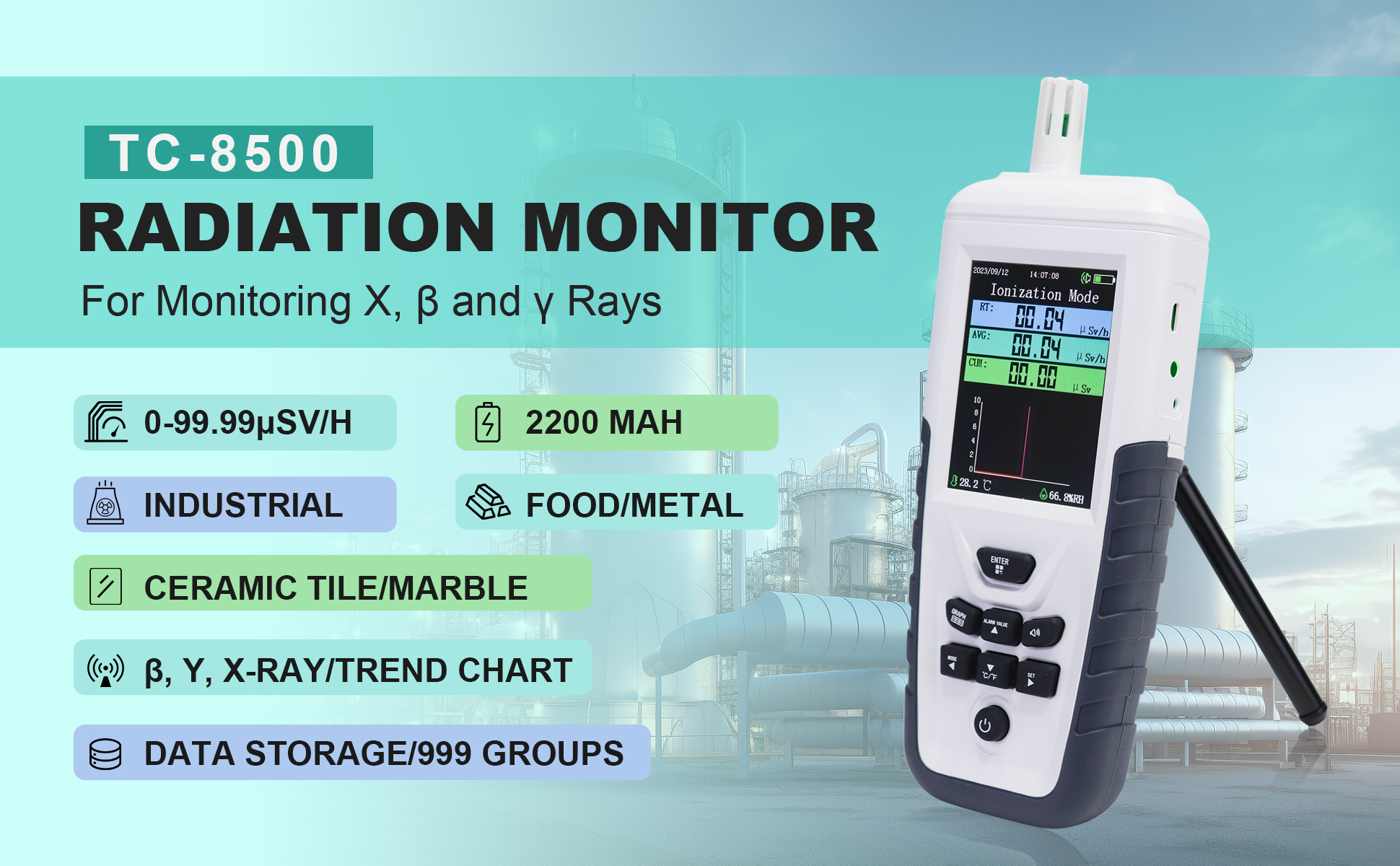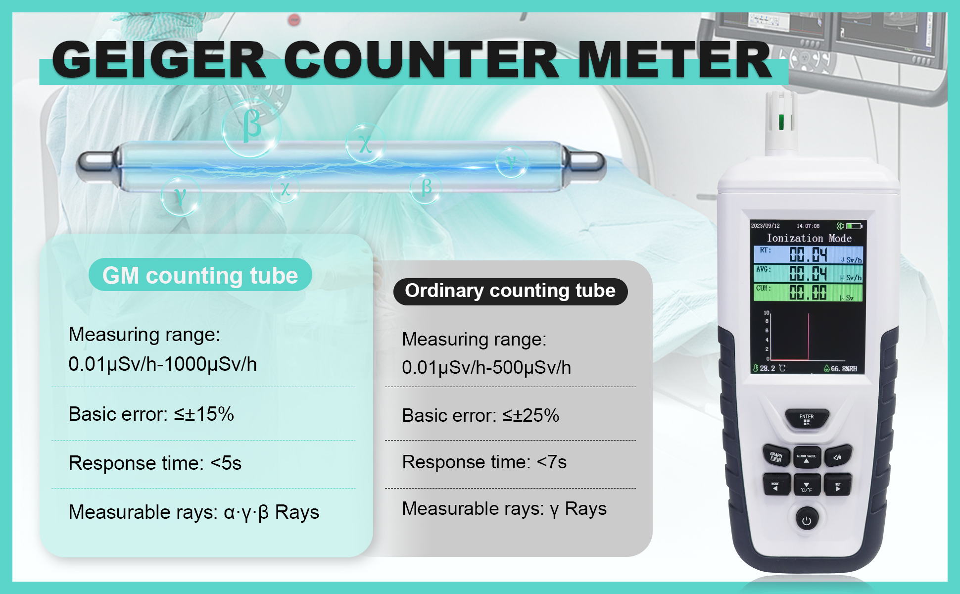 Radiation monitoring in real-time, detect nuclear radiation, X, β, γ-rays, importand survival tool, displaying the radiation value of the surrounding environment.