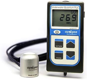 The MQ-650 quantum meter is designed for underwater ePAR measurements and already applies the sensor's immersion effect correction factor to the meter readings through firmware. The meter provides excellent measurements under all light sources, including LEDs. The meter consists of a waterproof quantum sensor attached via waterproof cable to a handheld meter. The waterproof sensor incorporates a blue-enhanced silicon photodiode and custom optical filters with a rugged, anodized aluminum body with acrylic diffuser. The underwater quantum sensor is typically used in salt water aquariums where corals are grown. Note: The handheld meter is not waterproof, only the sensor and cable are waterproof. The meter has a sample and log mode, and will record an integrated daily total in mol m-2 d-1. Sample mode will record up to 99 manual measurements. Log mode will power the meter on/off to make a measurement every 30 seconds. Every 30 minutes the meter will average the sixty 30 second measurements and record the averaged value to memory. The meter can store up to 99 averages, once full it will start to overwrite the oldest measurement with new ones. An integrated daily total will be recorded from the 48 averaged measurements (making a 24 hr period). Sample and log measurements can be reviewed on the LCD display or by downloading the data to a computer, however, the integrated daily total can only be viewed by downloading the data to a computer. Downloading data to a computer requires the AC-100 communication cable (a standard USB cable will not work) and ApogeeAMS software.