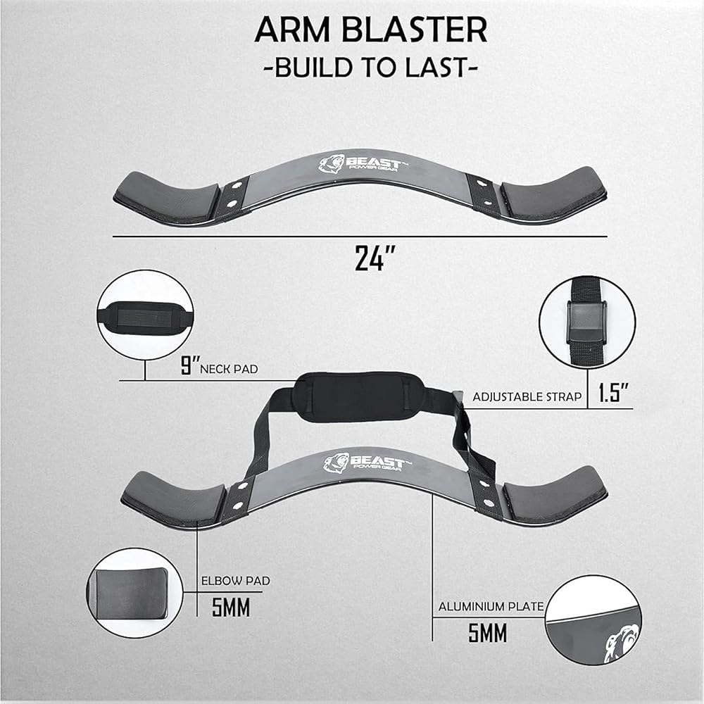 Heavy Duty Construction: 24” long, 3.5” wide, 5mm thick heavy duty metal arm blaster for biceps & triceps has adjustable heavy buckle clip with fully adjustable 1.5” strap, strong rivets and suitable for all body types.