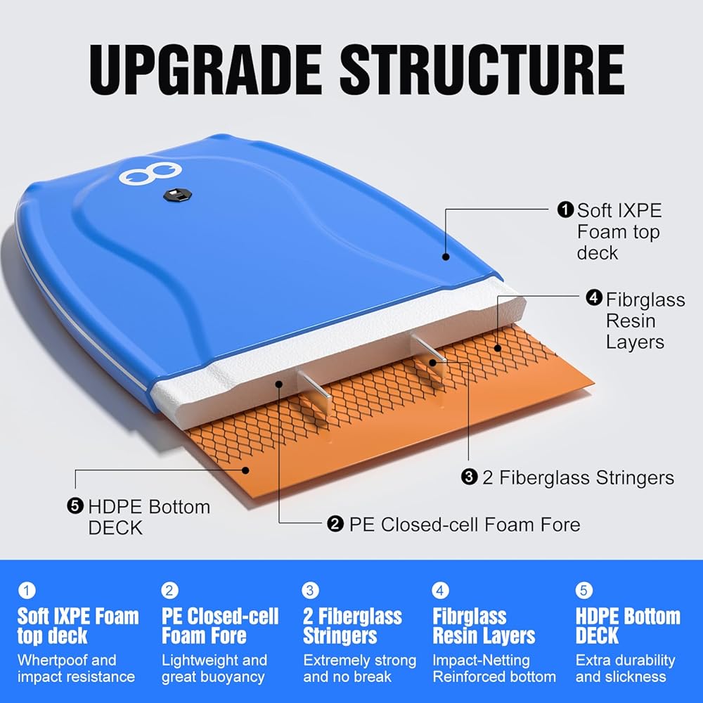 ☞ 【DURABLE CONSTRUCTION 】With IXPE surface, the WOOWAVE body board is waterproof and has good impact resistance, comes with coiled wrist leash and board bag, due to the durable PE core with 2 FRP stringers, it will not break or deform easily and HDPE slick bottom surface for great performance, offers impact strength durability, buoyancy and increase speeds.