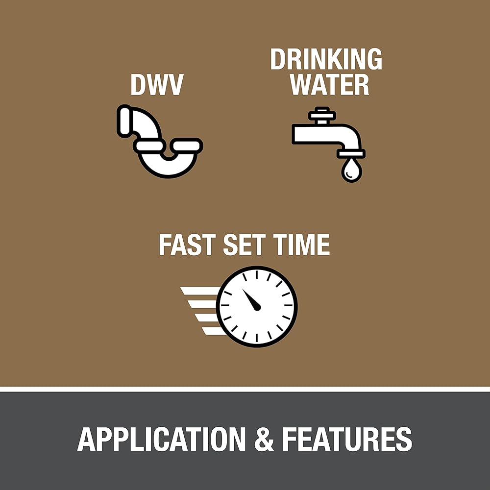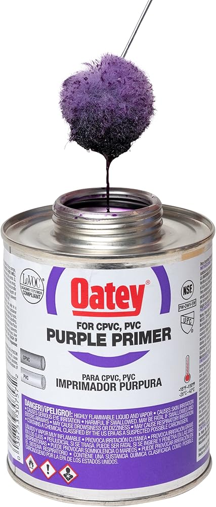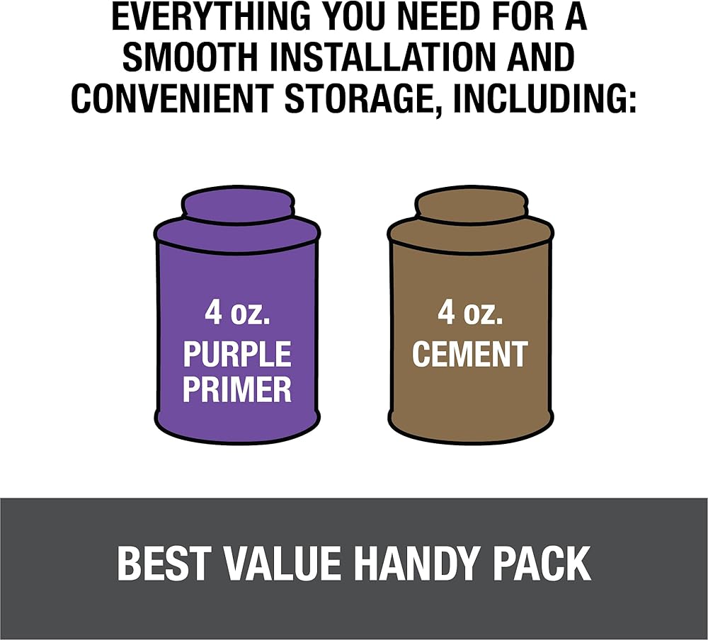 One 4 oz. can of regular PVC cement for PVC pipe and fittings. May be used for DWV and Schedule 40 pressure lines for potable water. Flows freely and sets up quickly. Apply at temperatures 40 F. to 90 F. NSF and UPC approved. Exceeds ASTM D 2564. One 4 oz. can of purple primer for PVC pipe and fittings. A purple tinted aggressive primer recommended for use on PVC pipe and fittings, all Schedules, and diameters. Formulated to remove surface dirt, grease, and grime as well as soften the pipe surface to allow for a fast, secure, and permanent solvent weld. For use in areas where code calls for verification that a primer has been used. NSF and UPC listed. Exceeds ASTM F 656