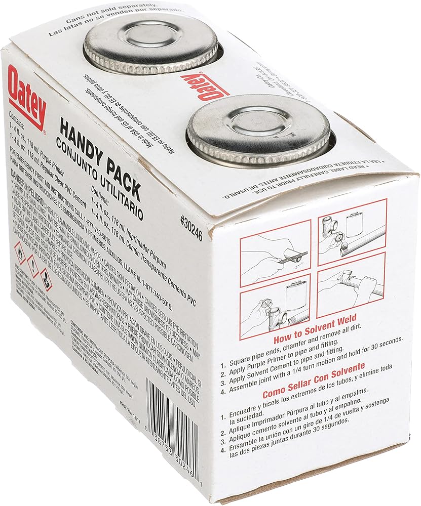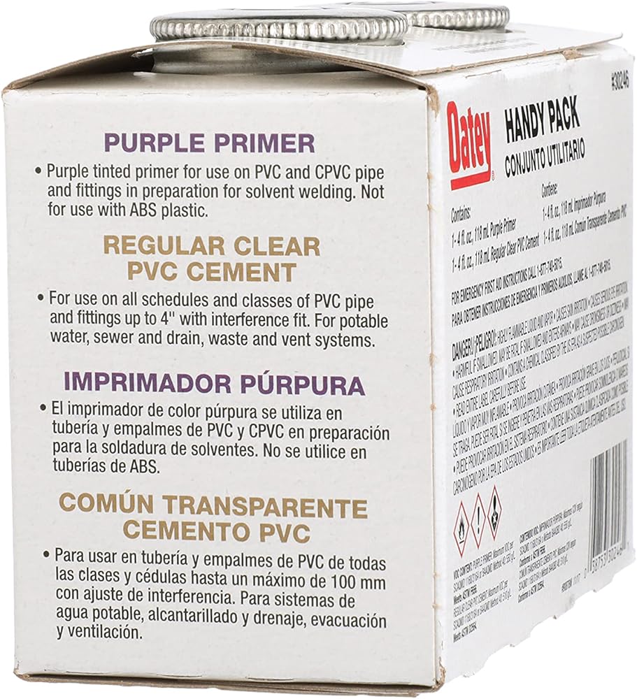Achieving professional-quality results from your DIY plumbing projects just got easier with the Oatey PVC Regular Cement and Purple Primer Handy Pack. This combo pack includes one 4 oz. can of all-purpose clear cement and one 4 oz. can of purple primer for PVC pipe and fittings up to 4" for Schedule 40 and up to 2" for Schedule 80 with interference fit. The regular clear cement is recommended for potable water, pressure pipe, conduit, and DWV applications. The cement flows freely and sets up quickly at the recommended application temperature of 40 to 110 degrees Fahrenheit. The industrial-grade, aggressive purple primer is recommended for use on CPVC/PVC pipe and fittings of all schedules and diameters, and it is for use in areas where code calls for verification that a primer has been used. The primer is formulated to remove surface dirt, grease, and grime as well as soften the pipe surface to allow for a fast, secure, and permanent solvent weld. Both the cement and primer are certified to UL Greenguard Gold as well as NSF and UPC approved. They exceed ASTM Standard D2564 and ASTM F 656, and they also comply with NSF/ANSI 61 health effects requirements. Since 1916, Oatey has provided reliable, high-quality products for the residential and commercial plumbing industries, with a commitment to delivering quality, building trust and improving lives. Today, Oatey operates a comprehensive manufacturing and distribution network to supply thousands of products for professional builders, contractors, engineers and do-it-yourself consumers around the world.