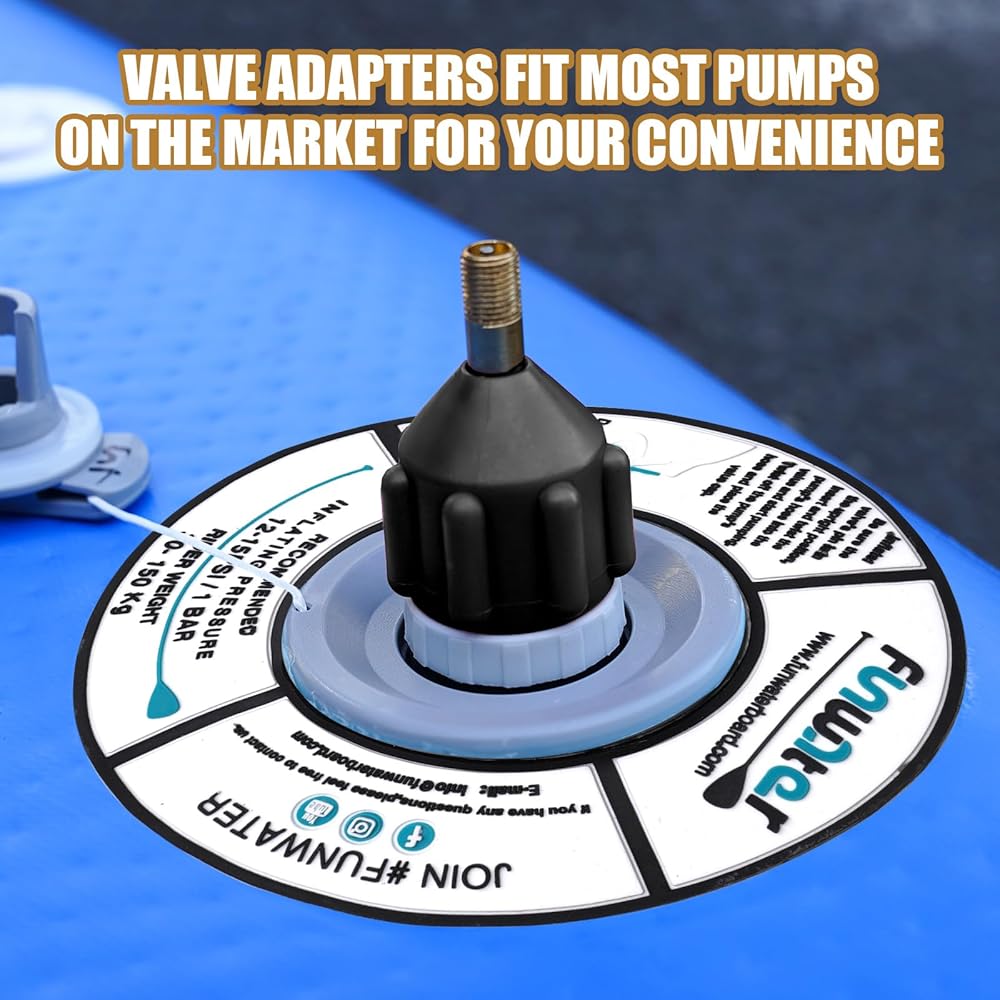 【Paddleboard Accessories】Each paddleboard is equipped with a single paddle, fins, valve adapter (able to fit most pumps on the market), you will reap the benefits of a colourful water experience. (Package contents are subject to pictures)