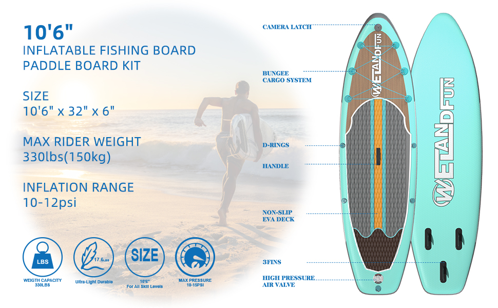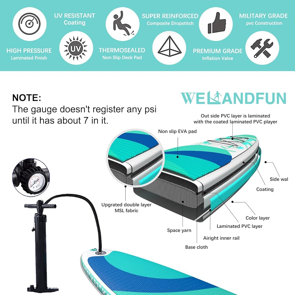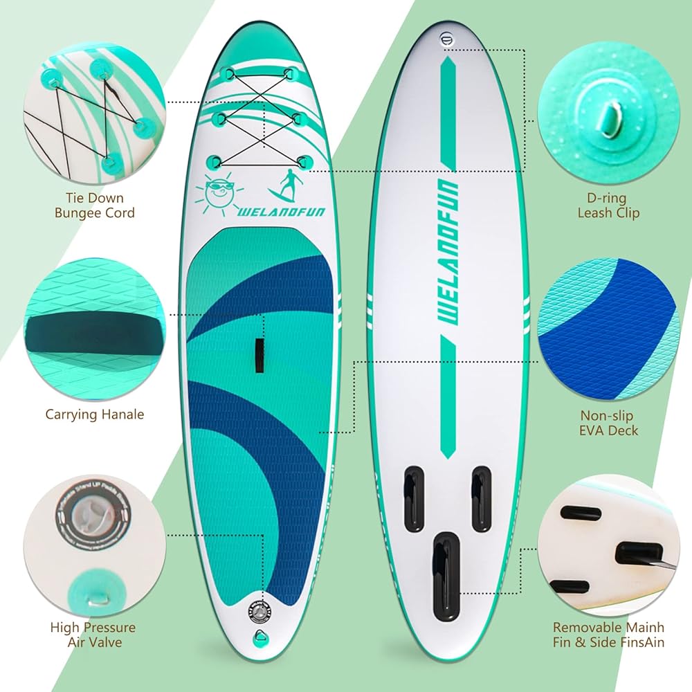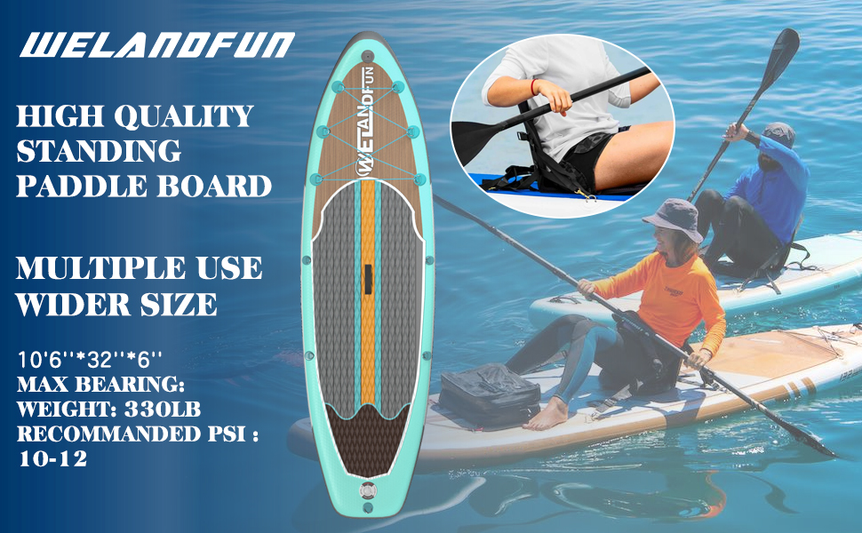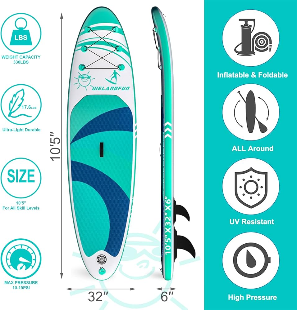 WIDE AND LIGHTWEIGHT SUP DESIGN - The WelandFun inflatable stand up paddling board is 10.5' long and provides 32'' of deck width 6” thick with a weight limit of 350 pounds.Paddle Boards Premium Inflatable Paddle Board is Made Of The Highest Quality Military Grade Material. Providing The Most Durable Lightweight Board On The Market.