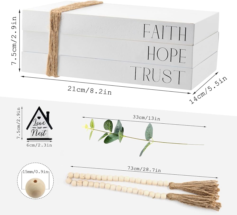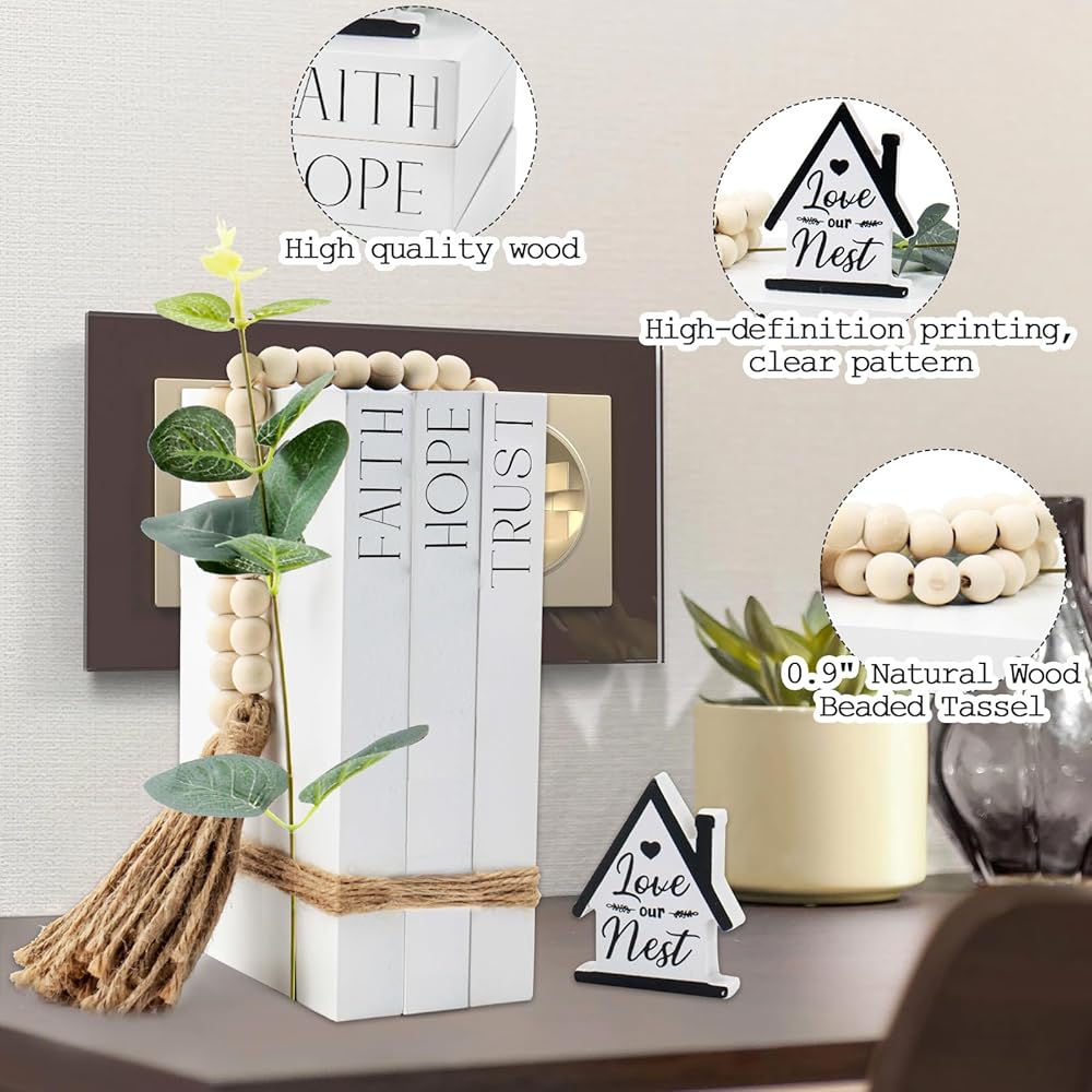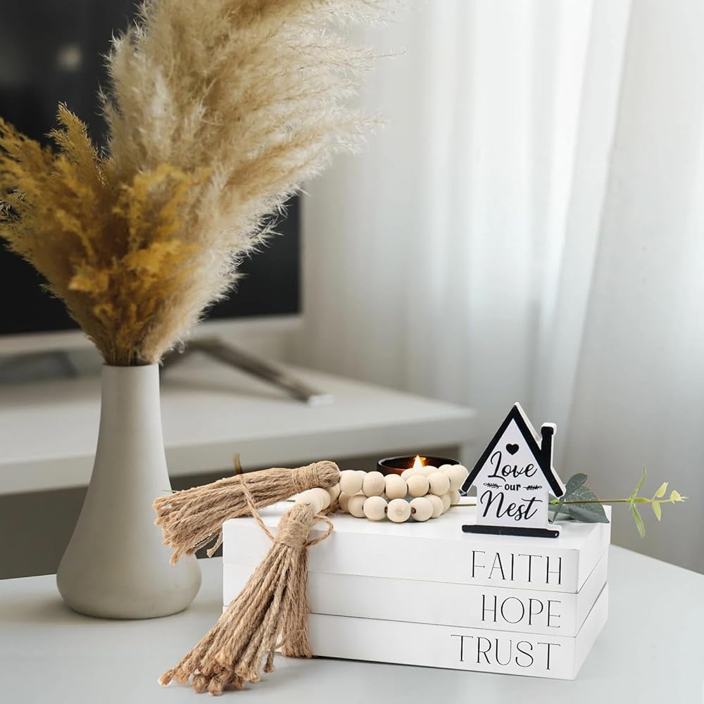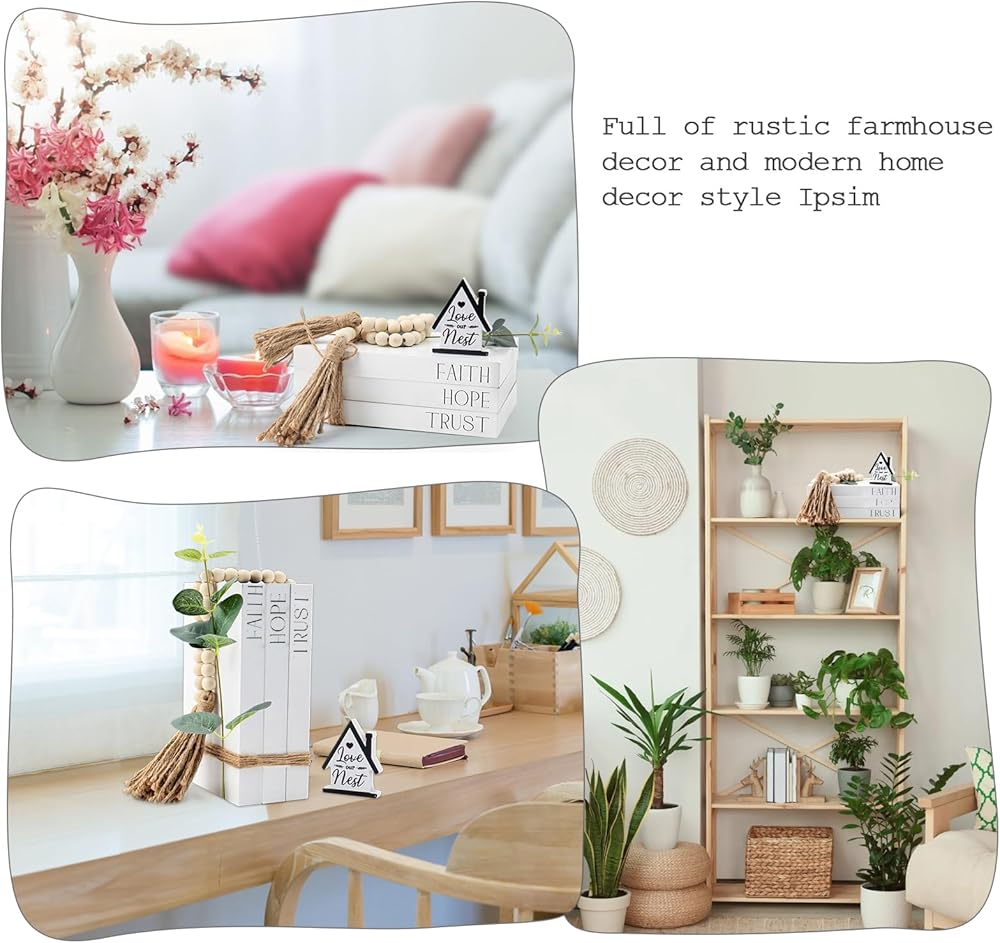 ❤️【Decorative Books Set】You will receive 3pcs wooden farmhouse decorative books which tied tightly with rustic twine, it reads [Our life], [Our story], [Our home],1 string of farmhouse beads with tassels,1 piece artificial leaf and 1 love our nest wood sign, suitable for a variety of home decoration.