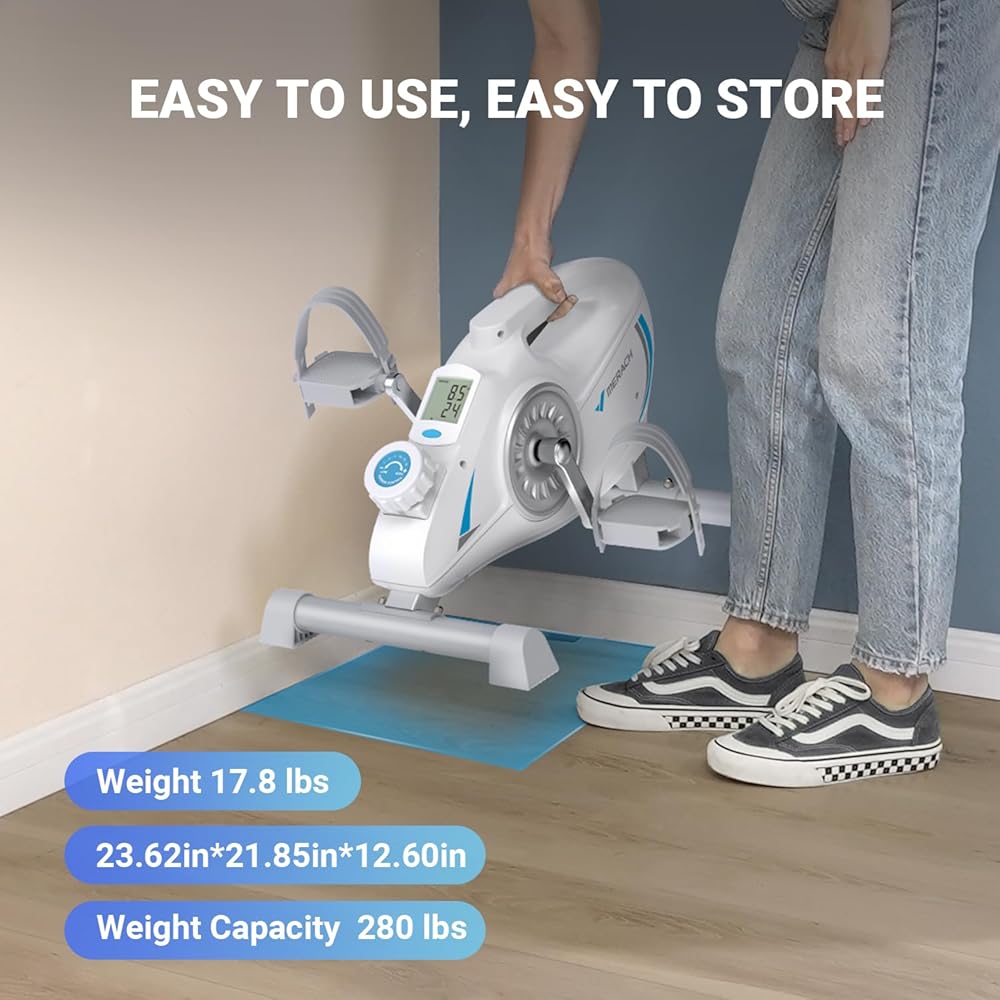 Portable Design: The mini exercise bike with carrying handle can be carried anywhere and easy to store. Product dimensions: 23.6L x 21.9W x 12.6H in | Product weight: 17.8 pounds | Weight capacity: 280 pounds
