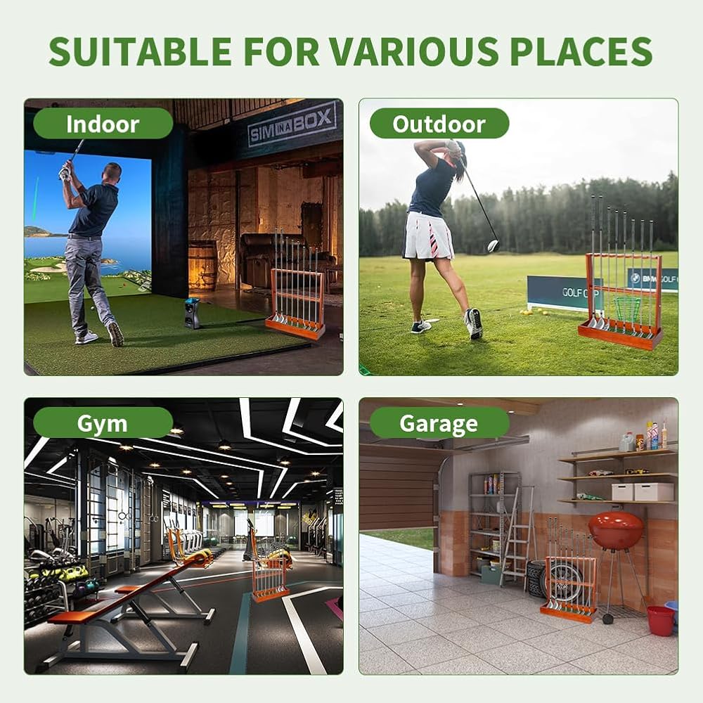 Stylish Wooden Putter Stand: The premium wooden putter rack with a professionally stained finish for storage and display. Unlike traditional metal racks, our wooden golf putter stand is more durable and long time use. 12 Golf Balls Organizer: With the capacity to hold up to 8 golf clubs and 12 golf balls. It is a convenient way to store your golfing equipment. Soft Grass Mat: We added the green artificial grass mat to support your golf putters, it is a good way to protect your clubs from scratches and damages. Easy Assembly: The wooden golf putter stand is easy to assemble without any external tools. You just need to tighten the screws in the correct holes to complete the installation. Widely Used: It is widely used for golf driving ranges, golf simulator driving ranges home club placement, etc.