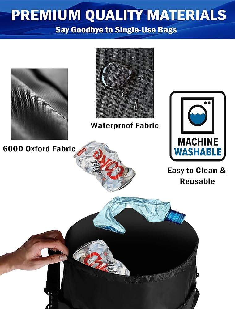 [Durable & Water-Resistant Material] Crafted from premium materials such as high-quality 600D Oxford fabric, and a waterproof Lining fabric, our boat garbage bag is built to withstand the rigors of outdoor activities like boating, fishing, and camping. Its triple-stitched seams reinforce its durability, ensuring it can handle various conditions with ease, keeping your trash secure and the environment tidy.