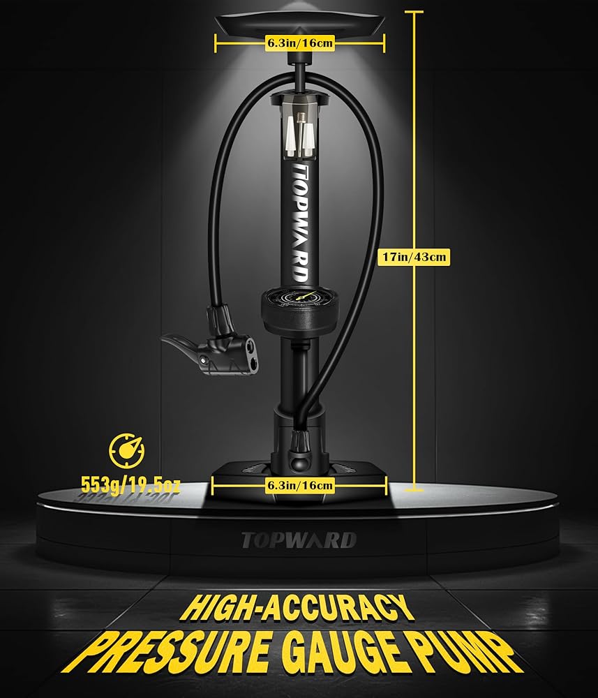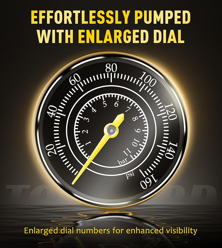 Accurate Pressure Gauge: Our bike tire pump features a built-in pressure gauge, allowing you to precisely inflate your tires to the desired pressure for optimal performance. Large pressure gauge is easy to read and includes both psi and bar measurements. Max 160 psi / 11bar