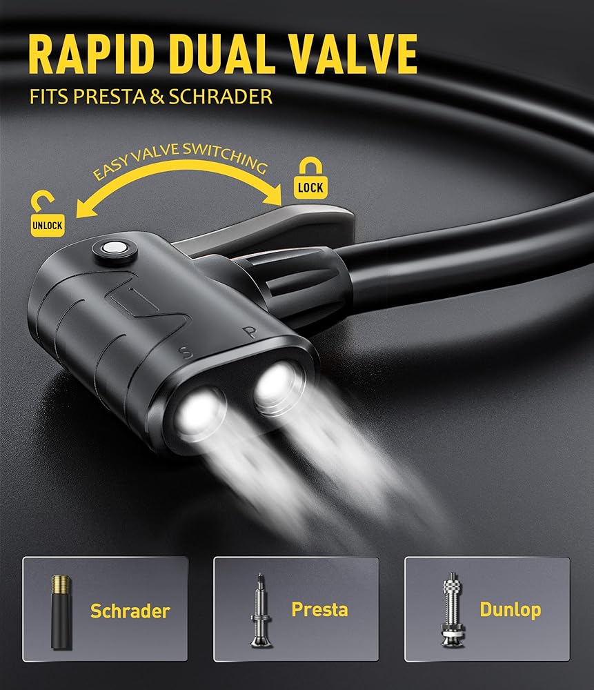 Presta Valve Pump: Equipped with a dual valve head, our bike air pump is compatible with both Presta and Schrader valves, Dunlop valves, providing versatile functionality.