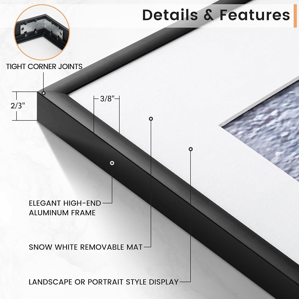 Display Precious Memories - Showcase your cherished moments with our 27x40 metal frame, meticulously crafted from premium aluminum alloy. It's lightweight yet sturdy with a superior quality finish. The white mat opening (measuring 23.5x35.5) is perfect for a 24x36 picture with the mat, or an 27x40 picture without it.