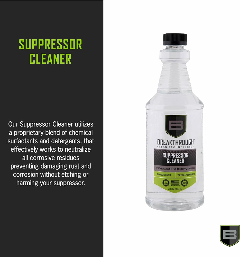 The Breakthrough Clean Technologies Suppressor Cleaner is a water-based, ammonia-free cleaner that removes heavy carbon and lead deposits. Utilizing a proprietary blend of chemical surfactants and detergents, this cleaner effectively neutralizes all corrosive residues, preventing damaging rust and corrosion without etching or harming your suppressor. With no noxious fumes or hazardous chemicals, the suppressor cleaner is a safe and effective choice for removing stubborn carbon and lead build-up in your suppressor.