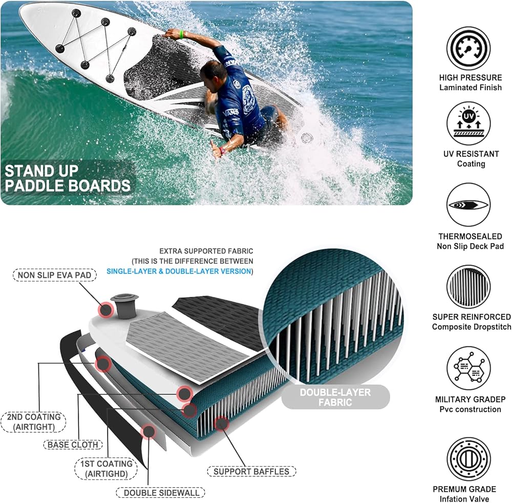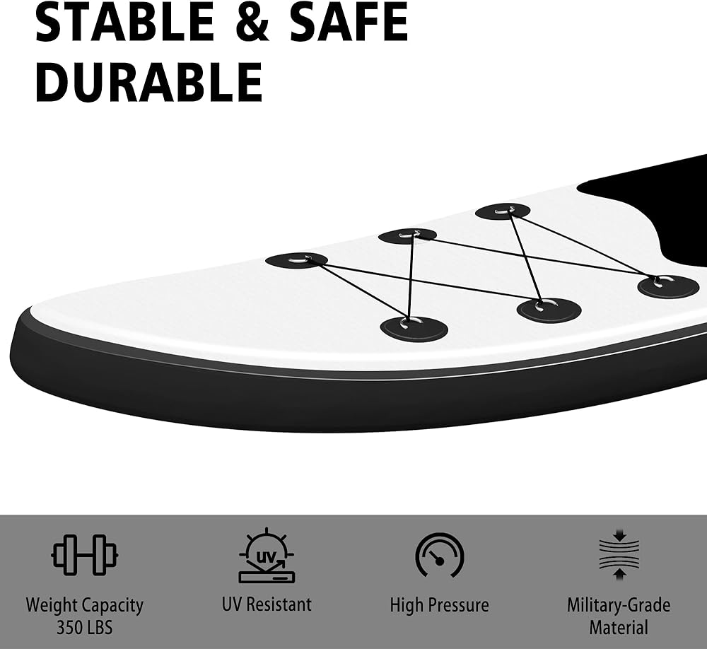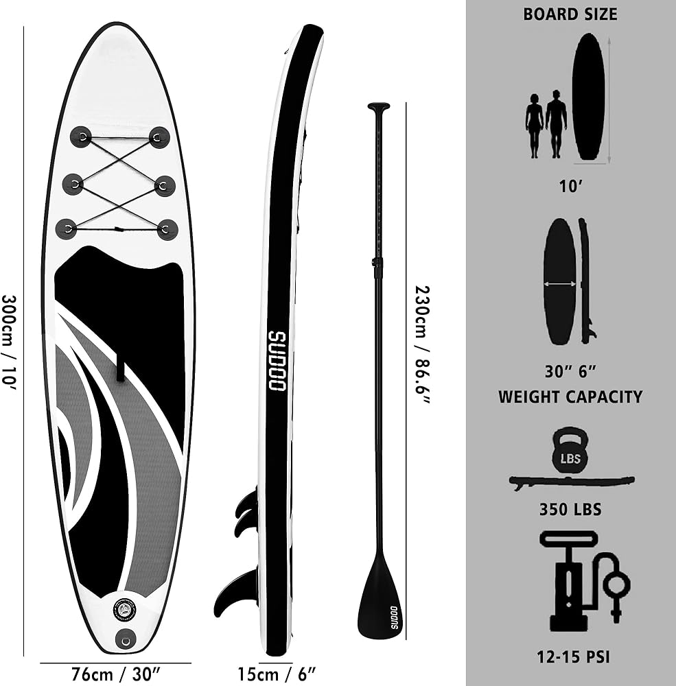 Wide and Lightweight Stand-Up Paddleboards: SUDOO Inflatable Stand Up Paddle Board measures 10.5' long 33" wide and 6" thick for improved stability and balance while standing. Paddle Board is made of the highest quality military grade material. Providing the most durable lightweight SUP Paddle Boards on the market. Perfect for Leisure Stand-up Paddle Board, Touring Paddle Boarding, for you riding the waves or practice a Stand Up Paddle Board. Maximum load-bearing capacity is up to 350 lbs.