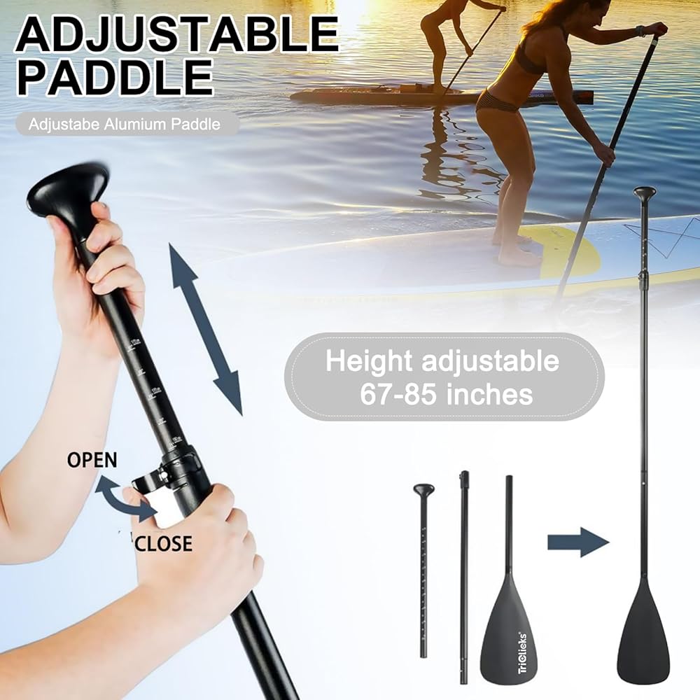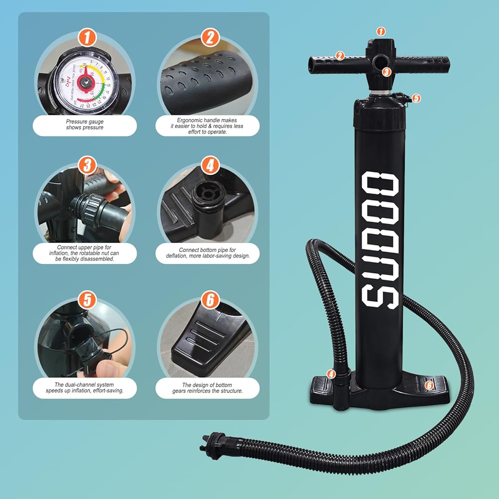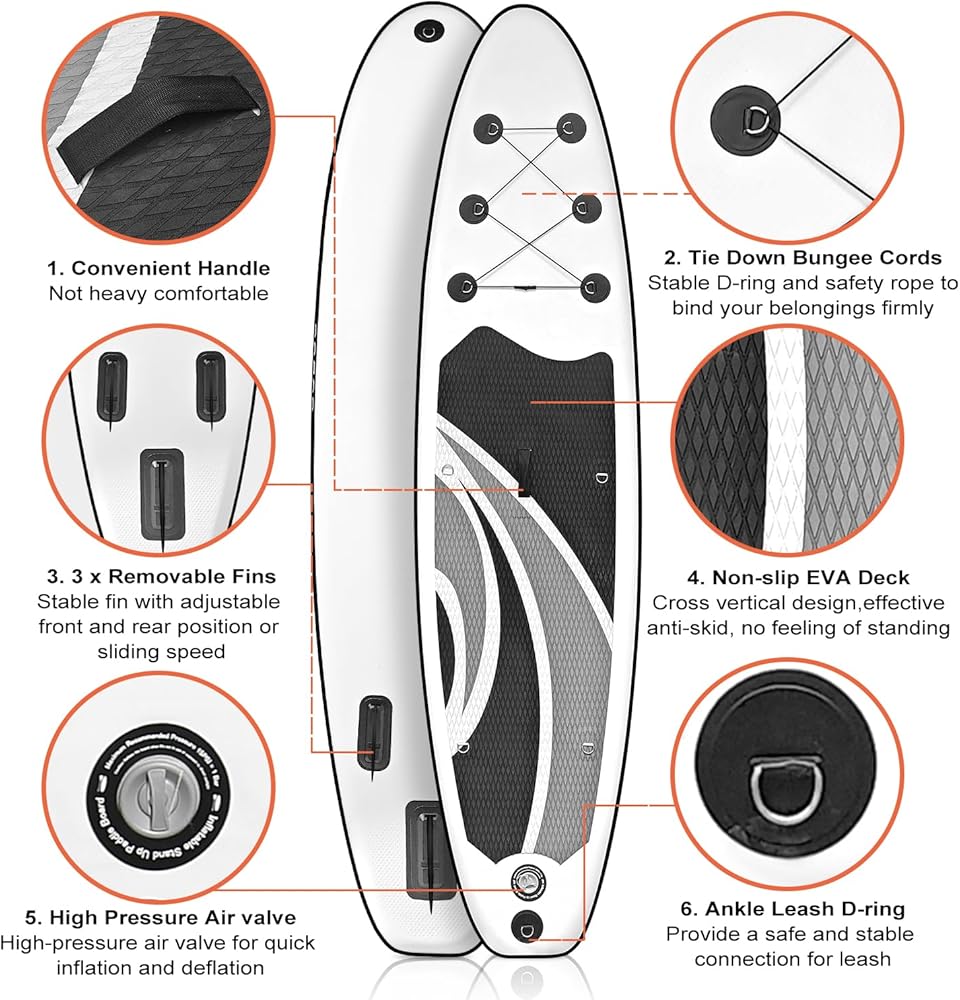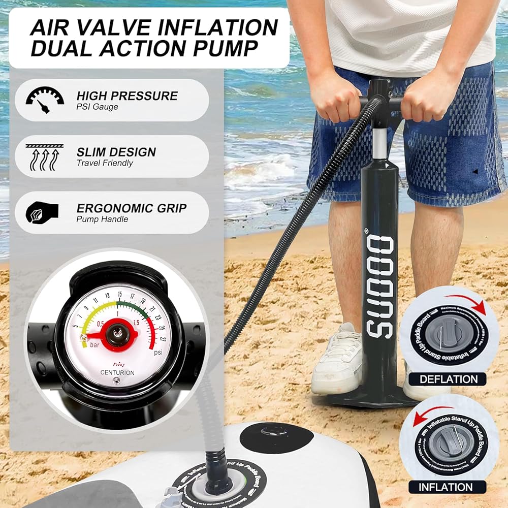 Package List: 1x SUDOO Inflatable Stand Up Paddle Board, 1x Backpack, 1x Safe Ankle Leash, 1x Adjustable Paddle, 1x Hand Air Pump, 1x Repair Kit. Quick Inflate and Deflate: SUDOO Stand Up Paddle Board within 10 minutes inflate and deflate easily. The upgraded 90-degree rotating Boston high-pressure air valve prevents leakage effectively. When fully inflated, the SUP Paddle Board is very frim and does not banana.