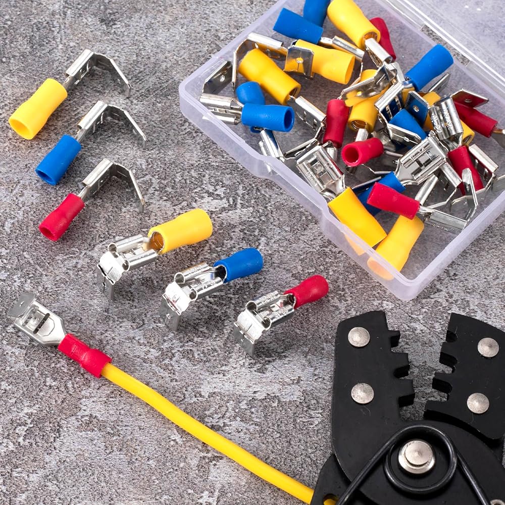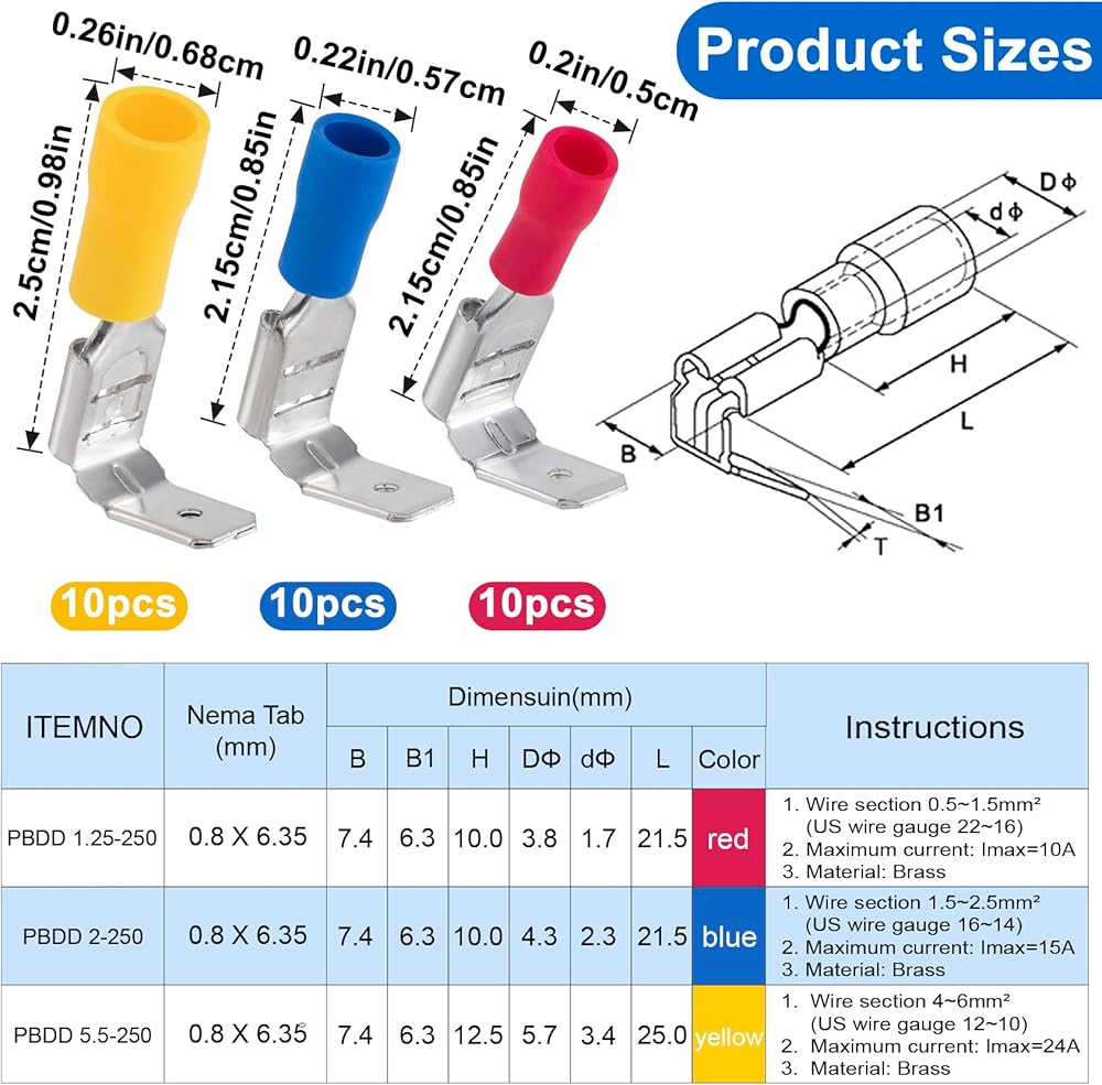 【Package List】30 Pcs semi-insulated piggyback spade connectors, including 3 models, 10 pcs each model.