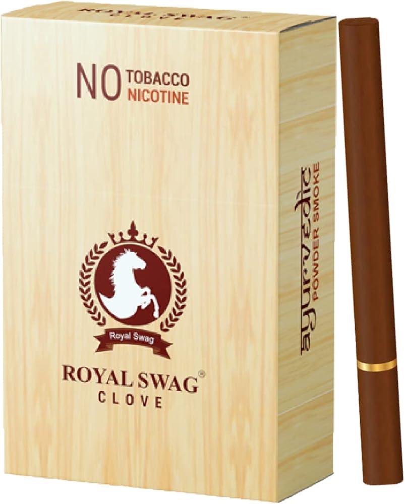 ROYAL SWAG Ayurvedic and Herbal Cigarettes are 100% Tobacco free and Nicotine free. These are made with fine ayurvedic and natural herbs like clove, tulsi or holy basil, cinnamon, mulethi and green tea. It is 100% natural, chemical free and additives free. It contains no artificial colour. It is non addictive (Made in India) product.