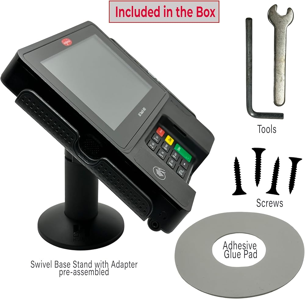 ✅【PACKAGE INCLUDES】: This point of sale stand is a complete kit. The package includes the Base Stand with Back Plate to attach the credit card machine (pre assembled), Mounting Screws, Allen Key and Wrench (tools), Adhesive Glue Pad. You can either screw down on counter surface or use Adhesive Glue Pad where Screw is NOT possible, exable - glass counter.
