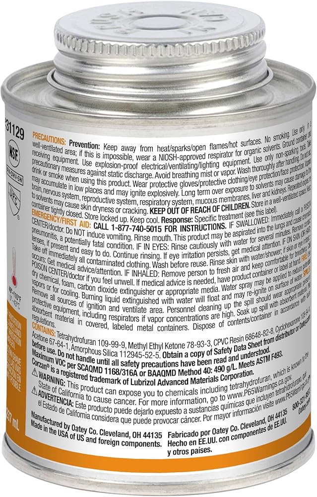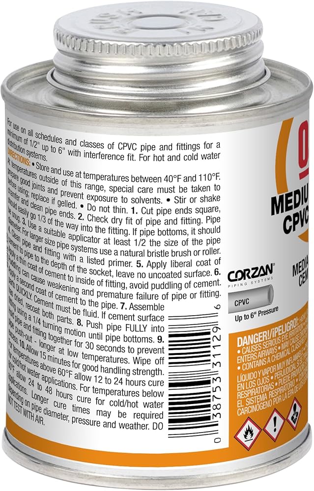 Oatey CPVC Medium Bodied Fast Set Orange Cement is recommended for residential and commercial hot and cold water systems. It is approved for Corzan CPVC Piping Systems. Oatey products have earned the trust of plumbing professionals for over 100 years.
