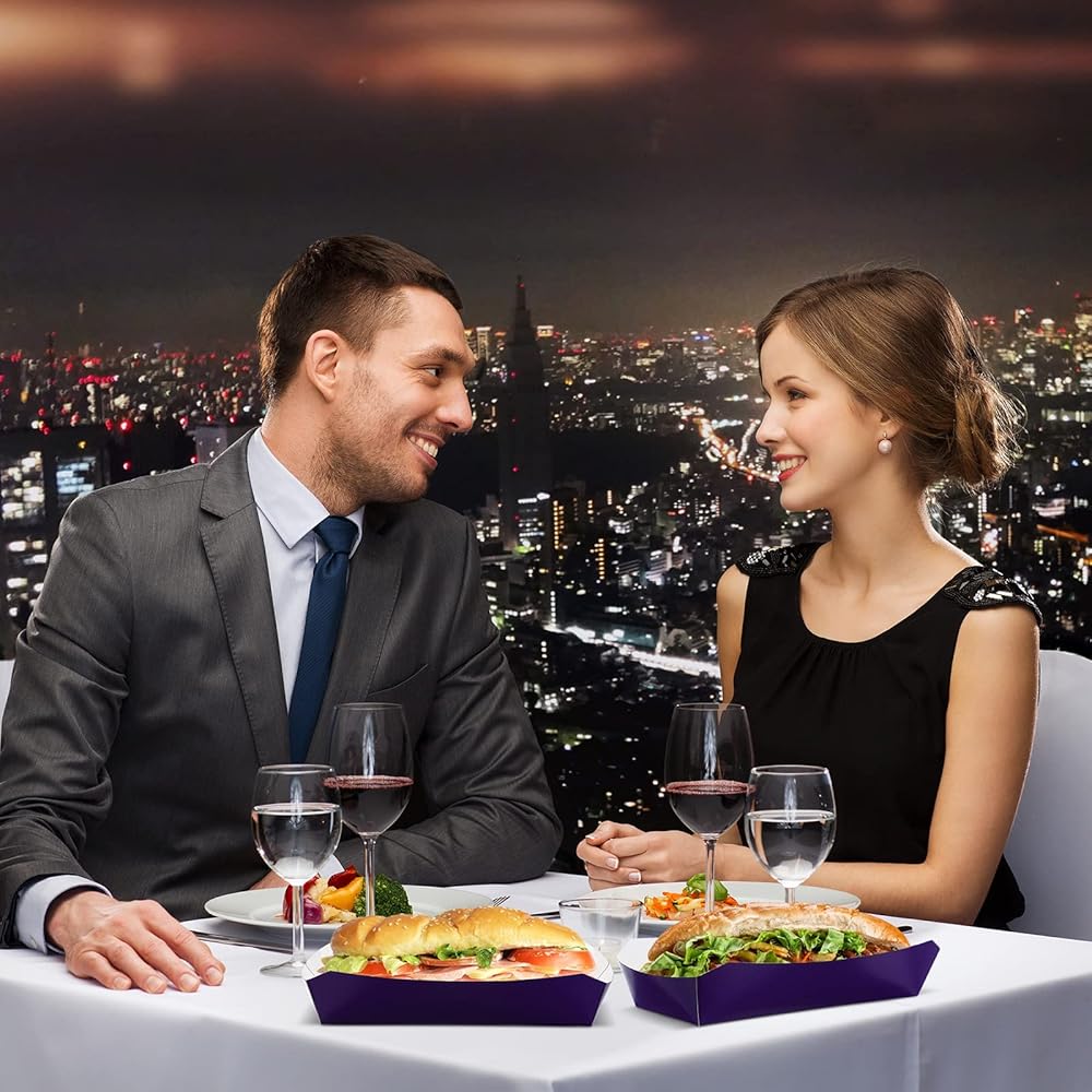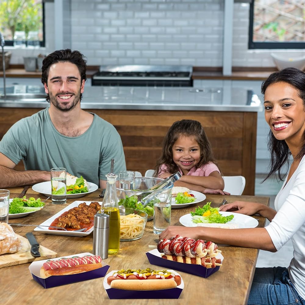 Ya sean hamburguesas, perritos calientes o pollo frito y papas fritas, mantenga los alimentos limpios y ordenados colocándolos directamente en estas bandejas de papel para perritos calientes.