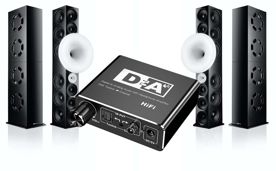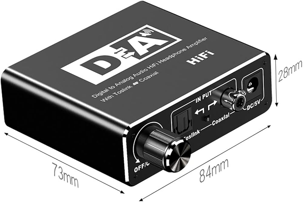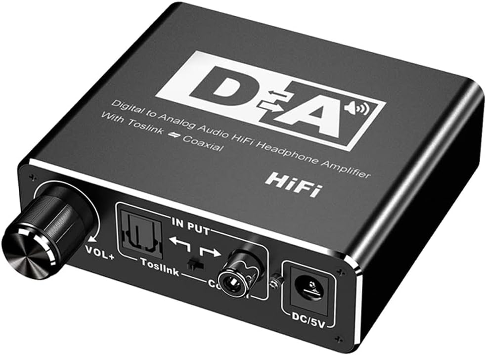 Converts digital audio signals (Toslink, Coaxial) to analog audio (L/R RCA, 3.5mm)