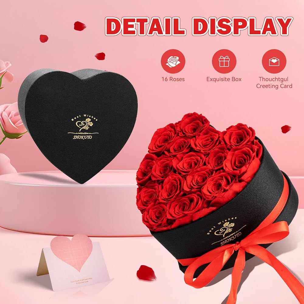 16-Piece Forever Roses in Heart Box,Preserved Rose Flowers,Birthday Gifts for Women Her Mothers Wife,100% Real Roses Last for 3 Years.Eternal Rose Gift Box for Valentines Christmas Mother's Day