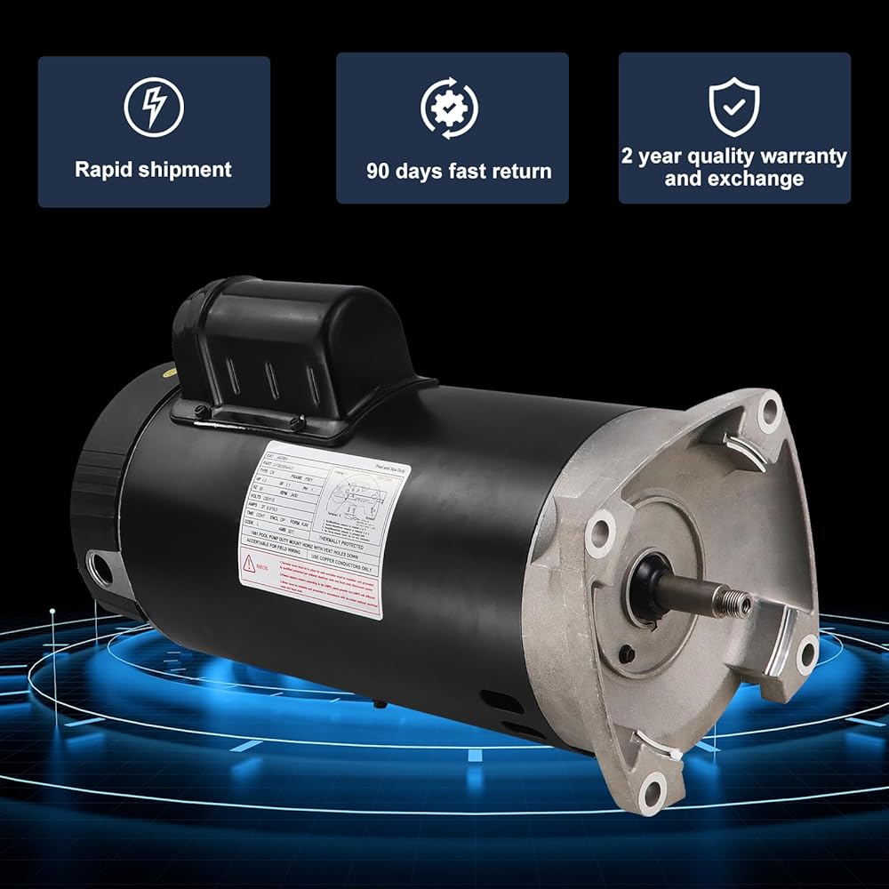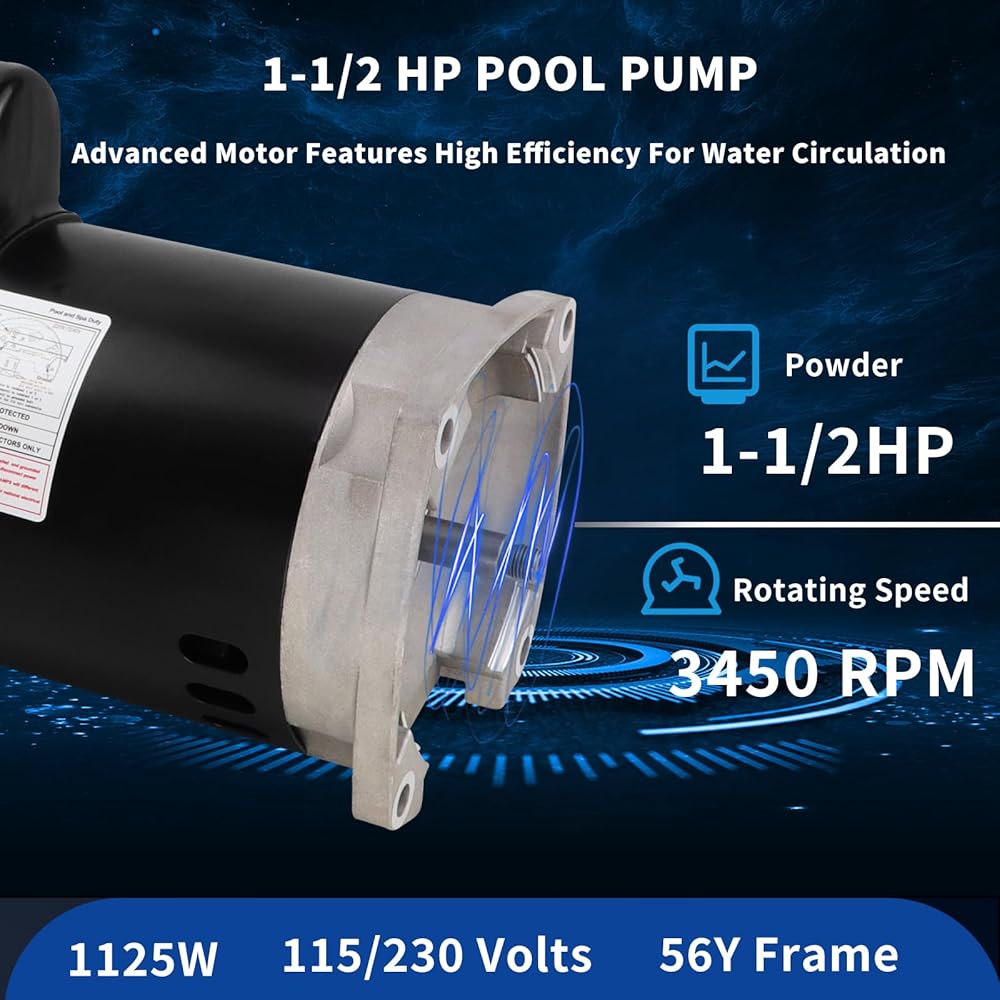 Square Flange Pool Motor,1-1/2 HP, 3450RPM rated speed, 230/115 volts. 8.0/16.0 Amps,Frame: 56Y, service factor: 1.1, frequency: 60Hz, please carefully check the parameters that need to be replaced on the motor before purchasing, to ensure the same voltage and single speed