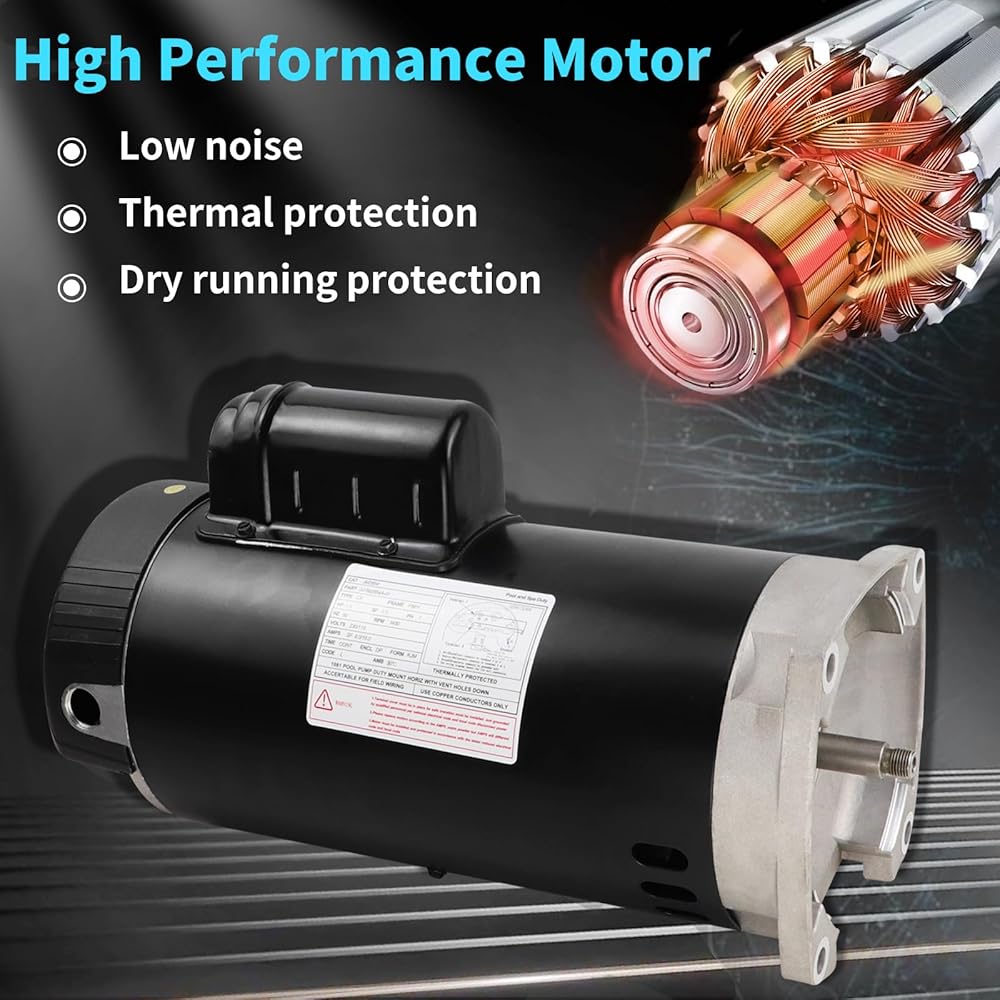 Upgraded materials:Pool motor 100% copper core for low noise operation, good speed control and waterproof treatment, square flange pool motor with cold rolled steel housing and threaded shaft for durability