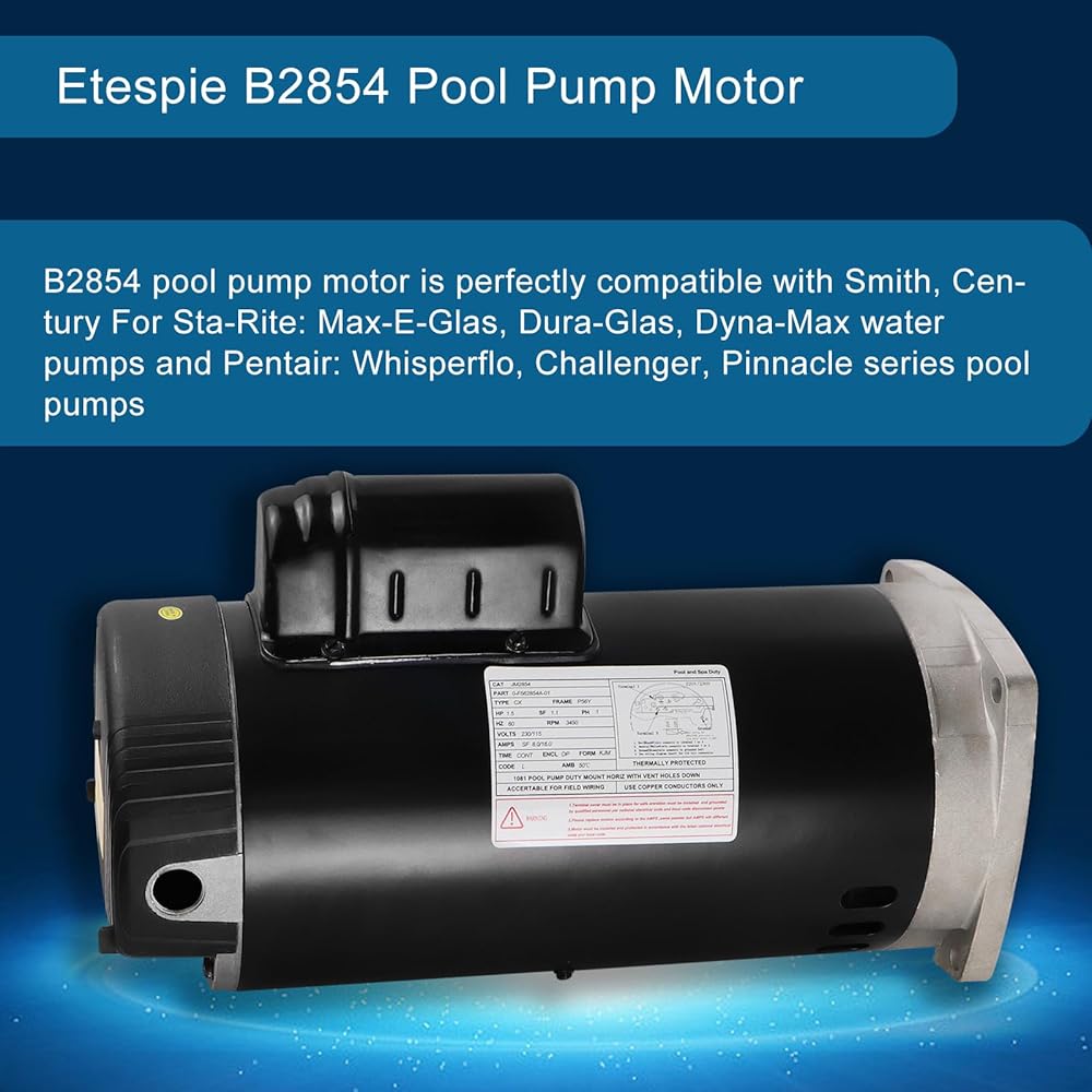 B2854 Pool Pump Motor, 1-1/2 HP, 3450 RPM, 8.0/16.0 Amps, 1.1 Service Factor, 56Y Frame, PSC Square Flange Pool Motor, Compatible with Century/Smith Pool Pump Motors.Pool and Spa Pump Motor