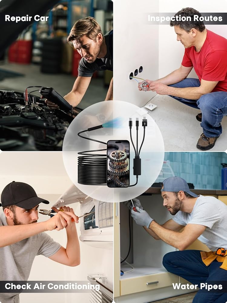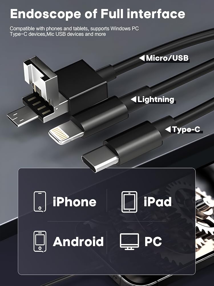 【Widely Compatibility】Endoscope comes with Type-C, Micro, Lightning 4 In 1 adapter power supply interface, compatible with 99% of mobile devices on the market which can be worked with Android 7.0+ and iPhone15+ and iPad with Type-c port