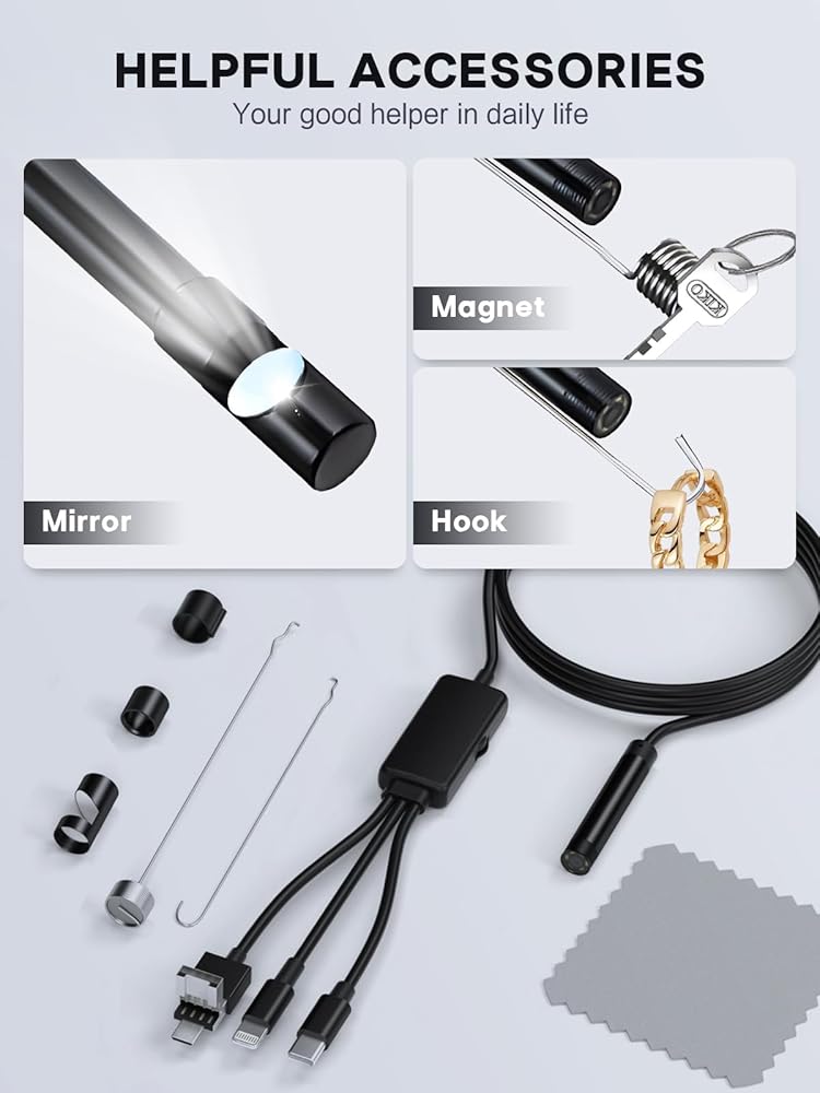 【What You Get】 Endoscope Camera *1, 16.5ft Semi-rigid Cable *1, Accessories: Magnet *1, Hook *1, Mirror *1, Protective Cap *1, Manual *1