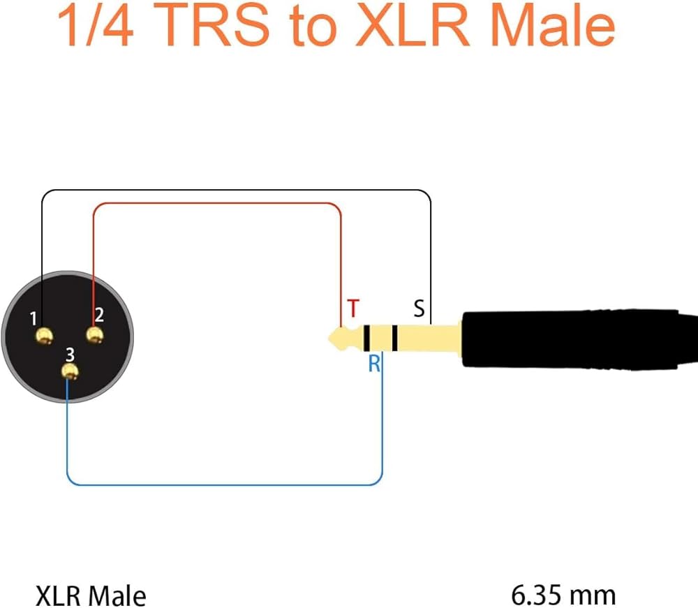 XLR pin 1 is connected to the 1/4" plug sleeve, XLR pin 2 is connected to the 1/4" plug tip, XLR pin 3 is connected to the 1/4" plug ring. 1/4 TRS to XLR Manle cable not include