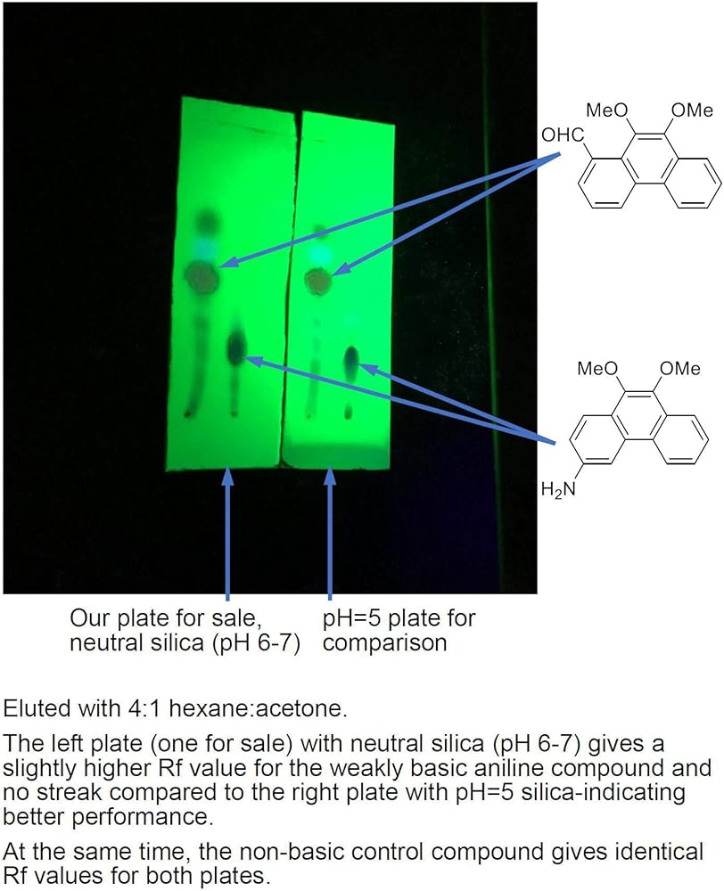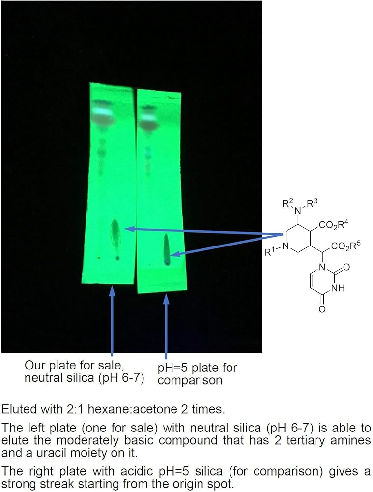 What's ideal is that these plates have neutral silica (pH 6-7) instead of the more common acidic silica (pH=5) for TLC silica plates.